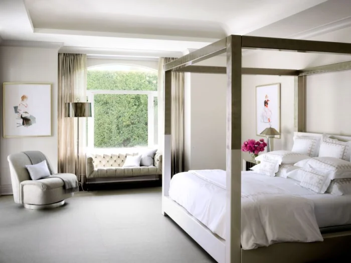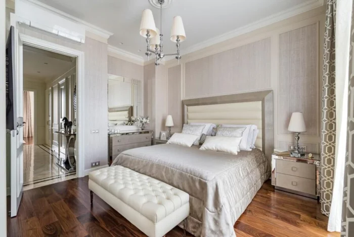 Для контраста в пастельной спальне можно добавить мебель с обивкой насыщенного синего или приглушённого золотистого цвета. Если же вы хотите яркий интерьер, саму мебель лучше выбрать в светлых, нейтральных тонах (серый, бежевый), чтобы не перегрузить восприятие.
