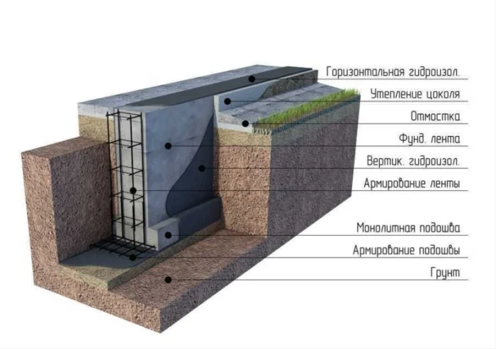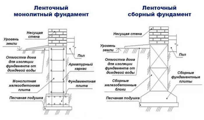 - Ленточный. Классика для частного сектора. Непрерывная бетонная «лента» повторяет контур несущих стен. Идеально для коттеджей и домов средней этажности.