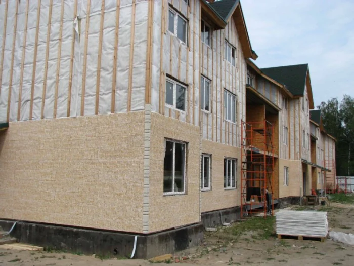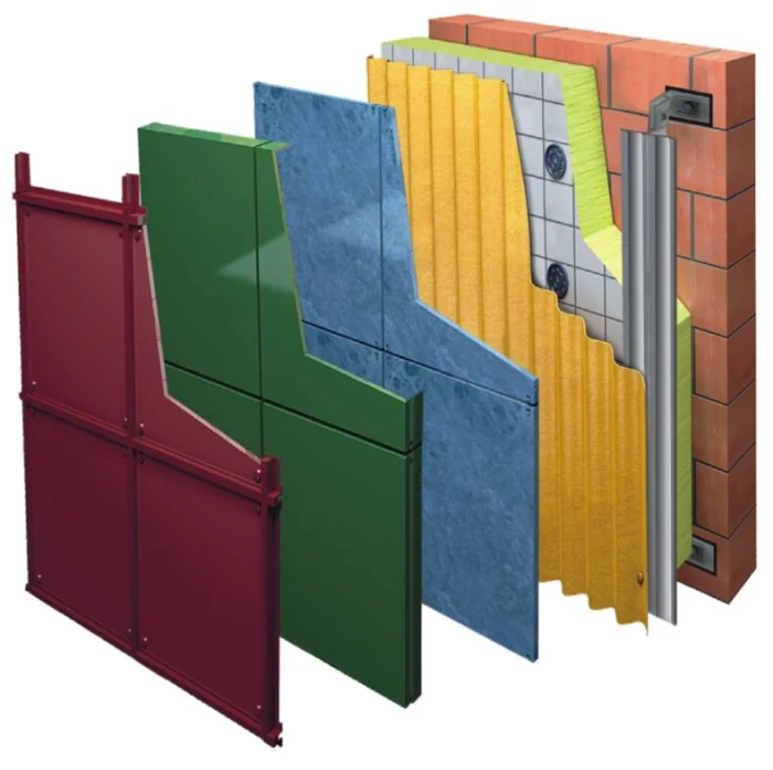 Конструкция проста: декоративно-защитный экран + слой эффективного утеплителя (чаще всего каменная вата или ЭППС) + иногда паро- и ветрозащитная мембрана. Готовый «пирог» стены.