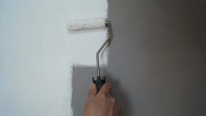При переходе с темного цвета стены на светлую краску используют специальную белоснечную или тонированную грунтовку-изолятор. Ее могут наносить в 2 слоя, чтобы полностью перекрыть старый цвет и избежать проявления пятен.