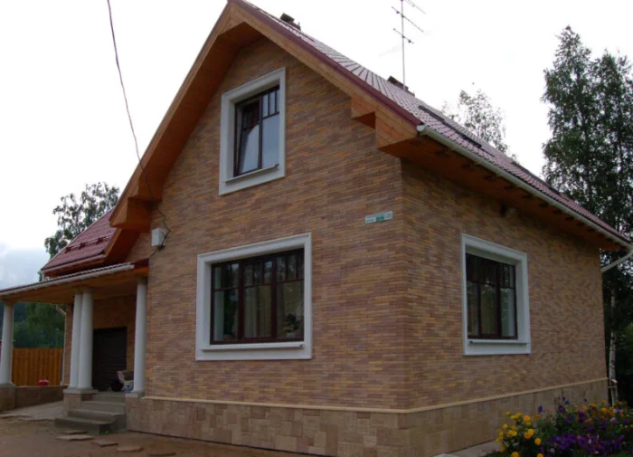 - Навесная система с клинкерными термопанелями. Это не полноразмерный кирпич, а тонкая (20-30 мм) плитка из клинкера, уже смонтированная на пенополиуретановую основу. Крепится на клей-пену и дюбеля к стене. Быстро, эффективно с точки зрения утепления, но дорого и не дает ощущения массивной кладки.