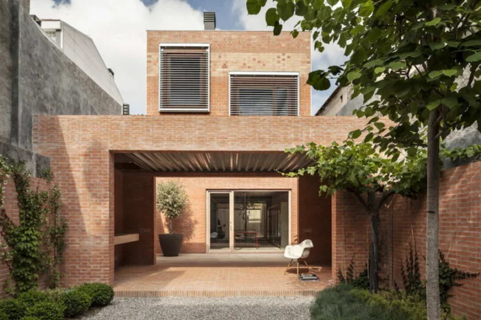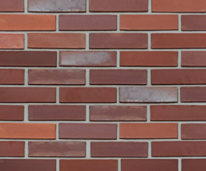 Терракотовые, красные, коричневые оттенки. Гладкая или слегка текстурированная поверхность. Стандартный или узкий формат. Кладка часто с расшивкой контрастного цвета (белый раствор).