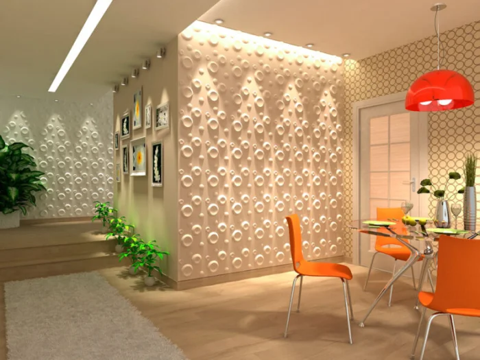 | Гипсовые | Лёгкие панели из гипса, которые могут стать рельефным панно с любым узором. | — Простые в монтаже. — Поле для фантазии: лепнина, геометрия, цветы — что душе угодно. — Абсолютно экологичны и безопасны. |