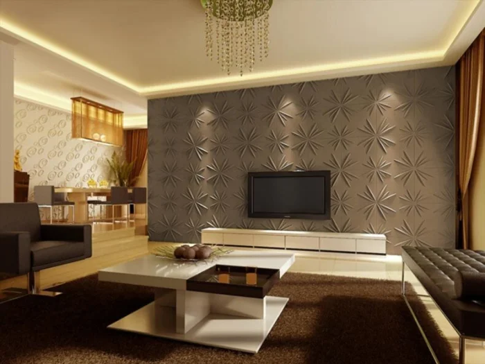 Любимый приём дизайнеров. Игра света и тени на рельефе создаёт невероятный объём. Одна такая стена заменяет собой всю остальную декорацию.