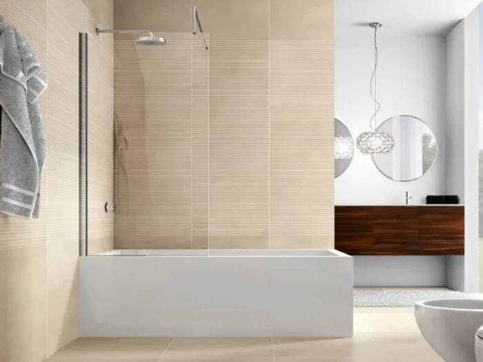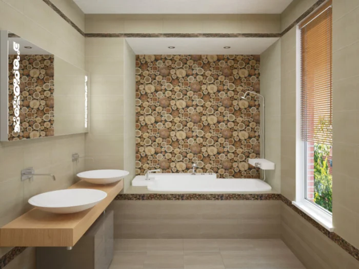 - Керамика. Практичная красота. Может имитировать кирпичную кладку, камень или дерево, оставаясь при этом влагостойкой и простой в уходе.