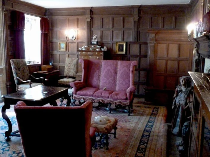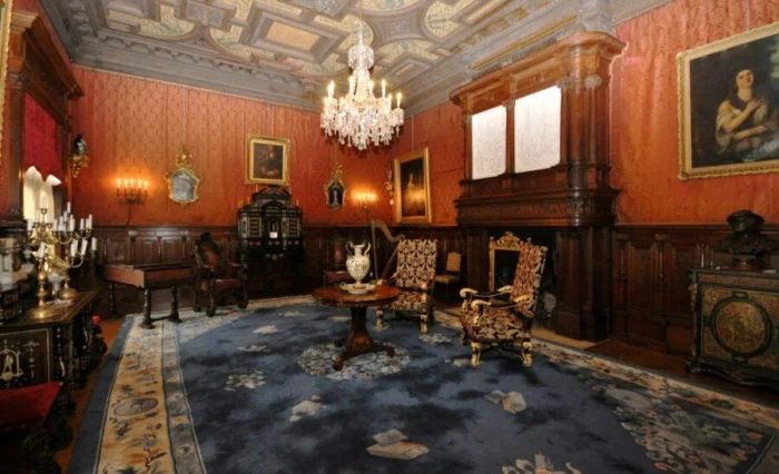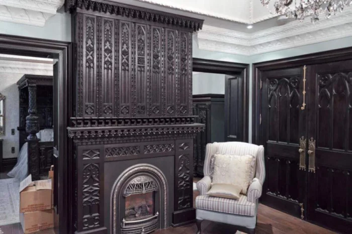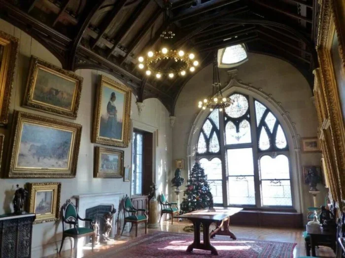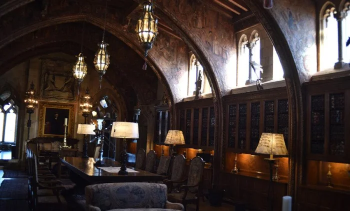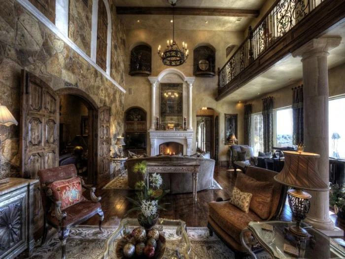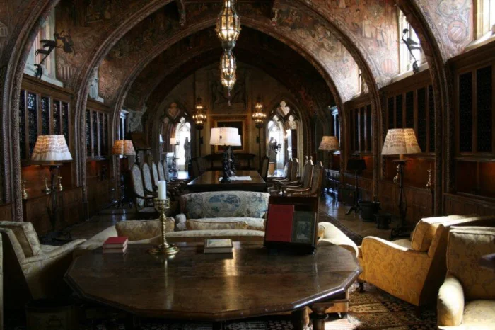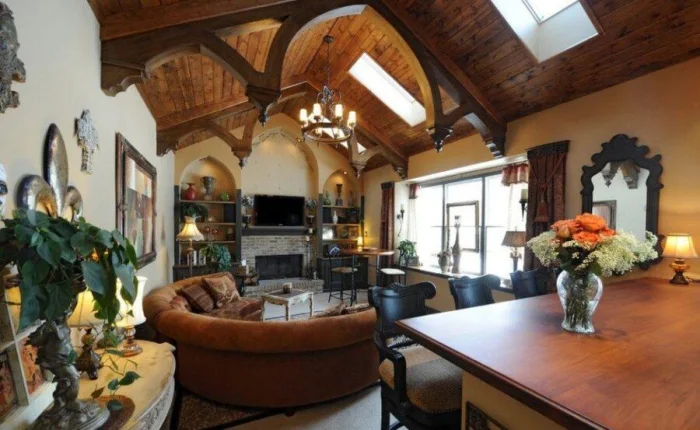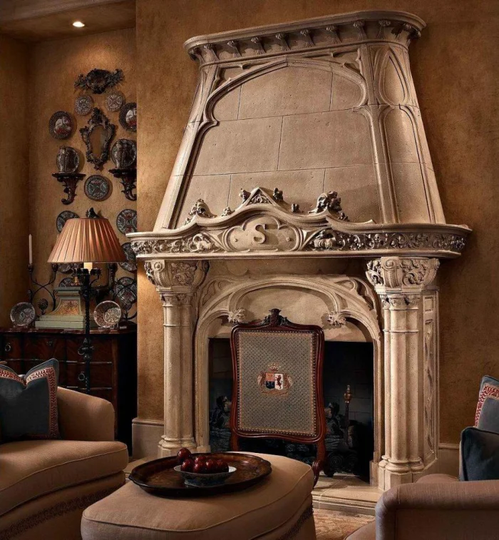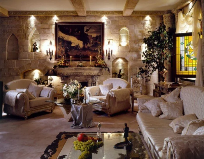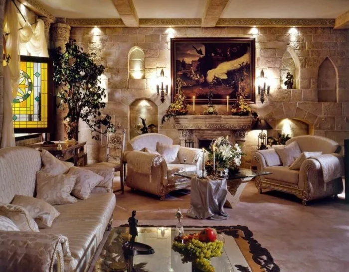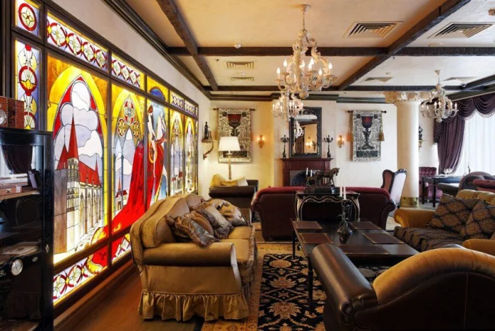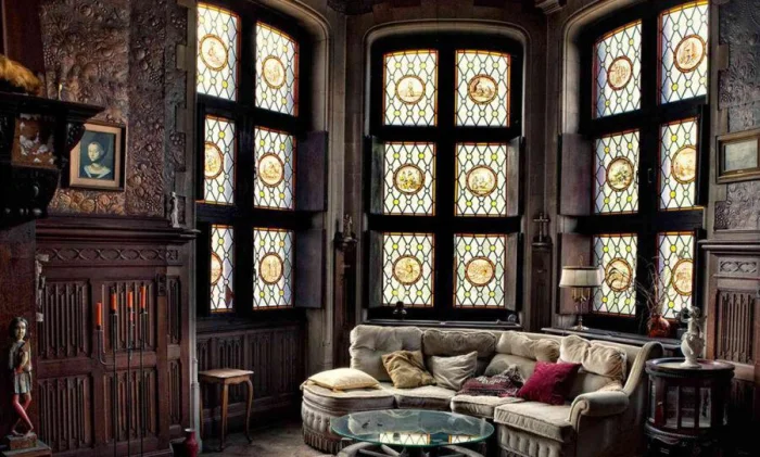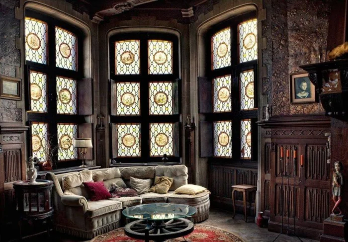 Здесь в ход идёт миниатюризация. Камин может напоминать крошечный замок с башенками. Витраж — быть не только в окне, но и в дверцах шкафа, в столешнице. Сюжеты — рыцари, замки, мифические существа. На стенах — гобелены или картины, стилизованные под средневековую живопись. Шторы — только из плотного, дорогого текстиля: бархат, парча, тяжёлый шёлк.