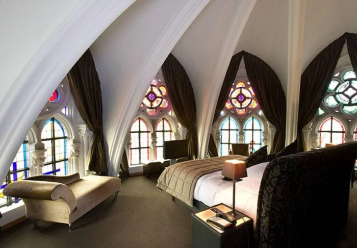 - Архитектурность. Стрельчатые окна, сводчатые потолки, арки.