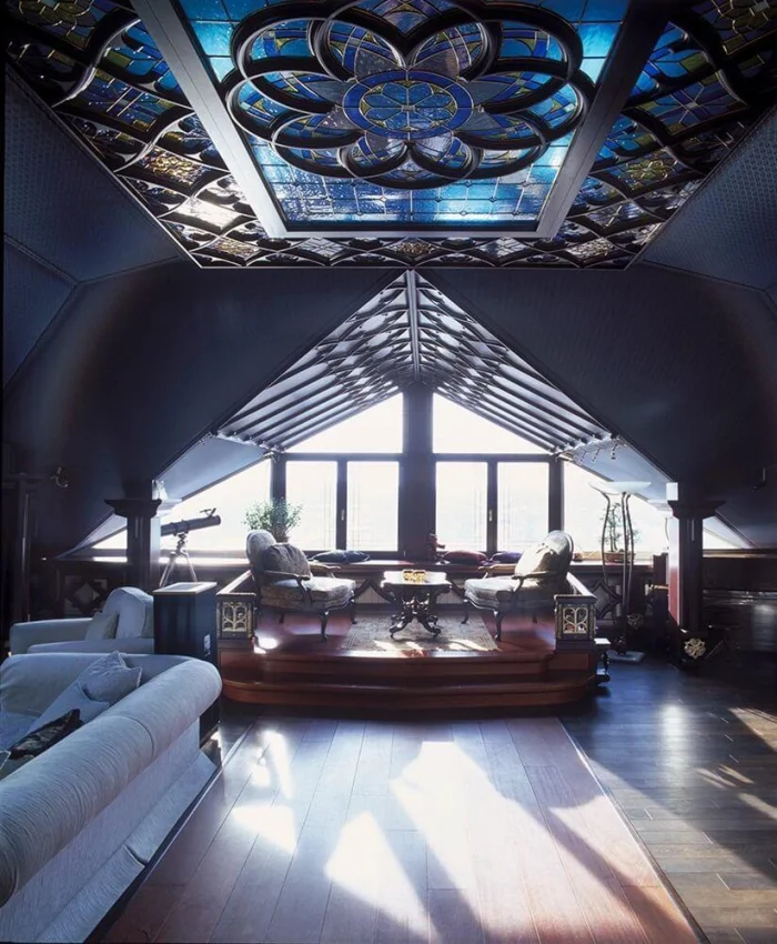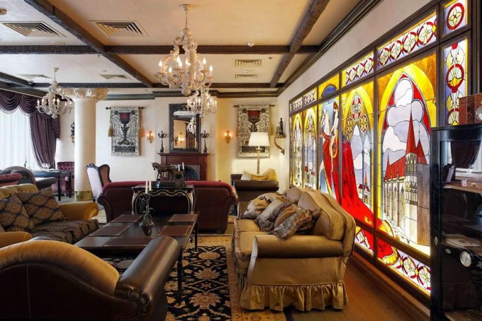 - Витраж. Без него — никуда. Цветное стекло с рисунком — душа стиля.