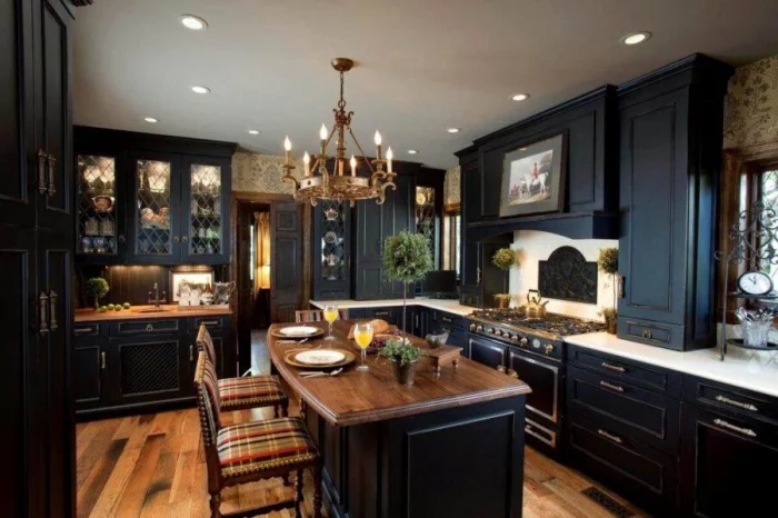 Готическая кухня — для эстетов, а не для фанатов готовки. Современную технику здесь нужно тщательно маскировать. Выбирайте холодильник и духовой шкаф в чёрном корпусе или за фасадами из тёмного дерева. Столешницу — из камня или массива. Фартук можно сделать из плитки, имитирующей каменную кладку.