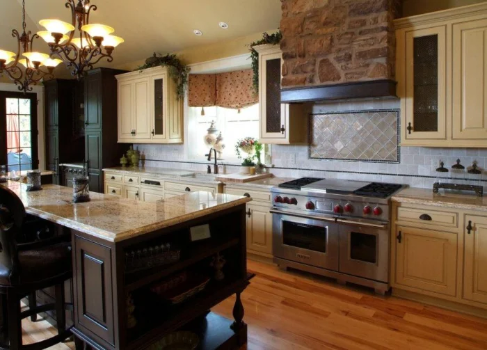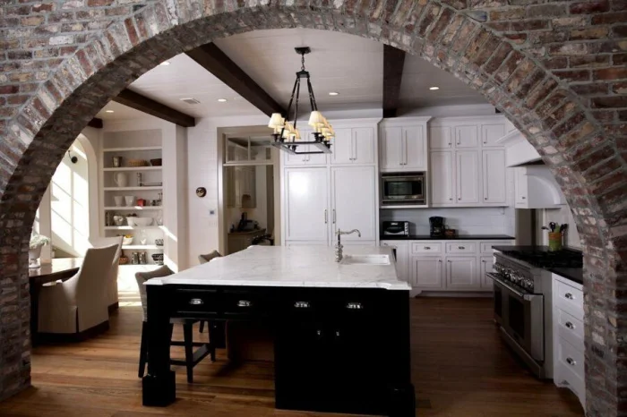 Допустим гибрид: современная начинка в готической «обёртке». Но все провода, розетки, щитки должны быть бесследно спрятаны. Задача — создать ощущение, что вы готовите в помещении старой замковой башни, а не на фабрике-кухне.