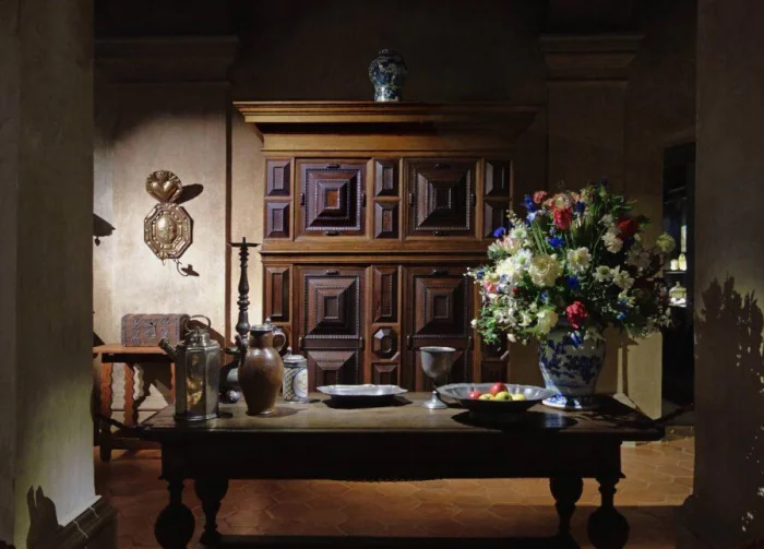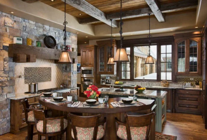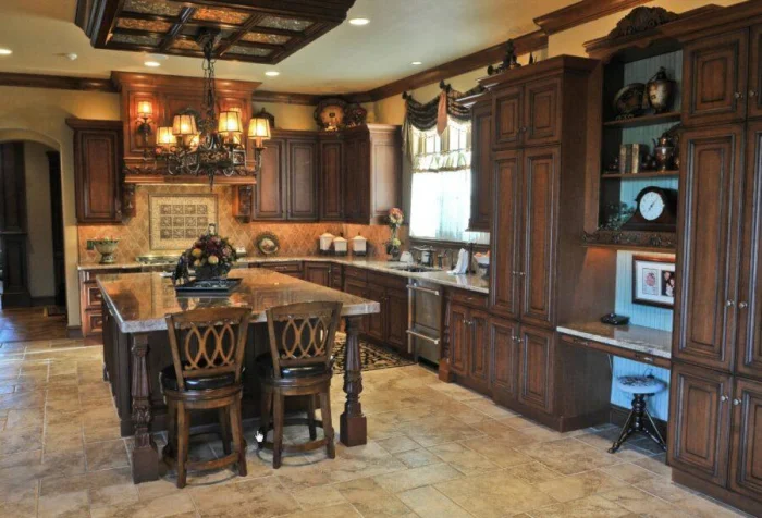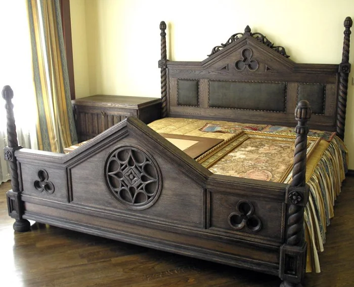 Мебель должна быть монументальной, высокой и безупречного качества. Кровать с балдахином или резным деревянным изголовьем — идеал. На кухне — массивный резной стол и стулья с высокими спинками, буфет с витражными вставками.