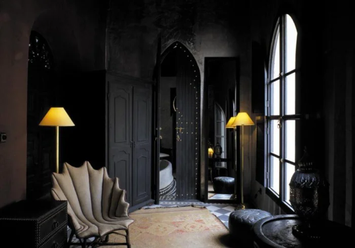 Вот главное открытие! Исторически готические интерьеры часто были светлыми: бежевые, кремовые, молочные стены служили фоном для тёмной мебели. Да, акцентные цвета — глубокие и благородные: вишнёвый, тёмно-синий, цвет старого вина, тёмный кармин. Но без светлого фона можно легко скатиться в мрачный подвал, а не в рыцарский замок. Нужен баланс.