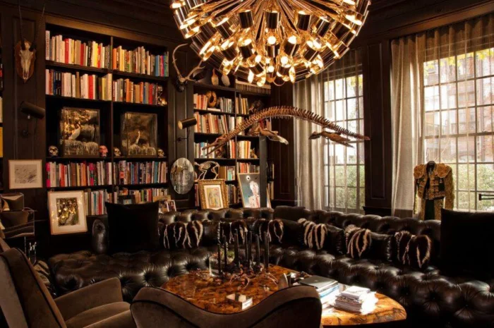 Каждая вещь — как миниатюрное архитектурное сооружение. Используйте витражи (пусть даже плёнку-имитацию), кожу, тёмное дерево, кованые элементы.