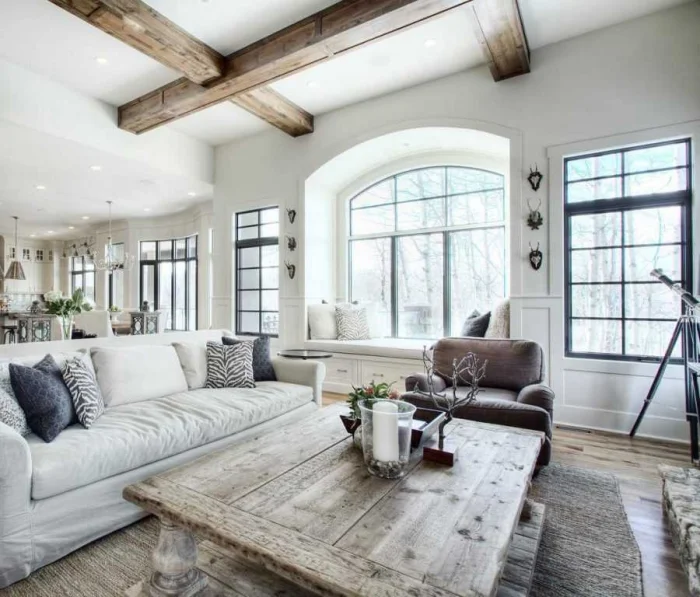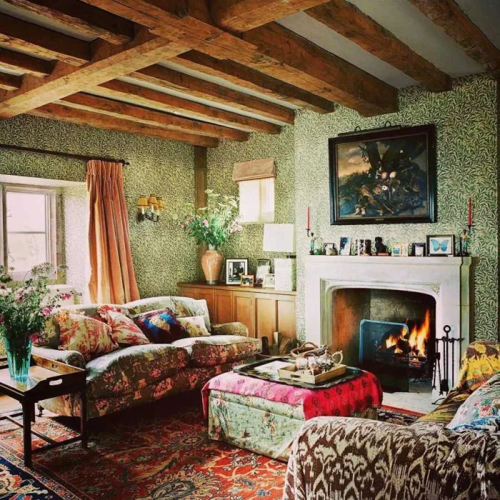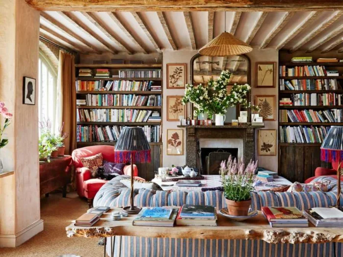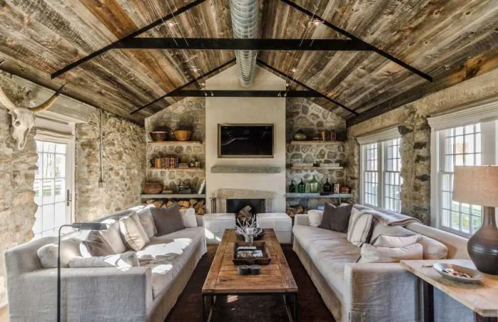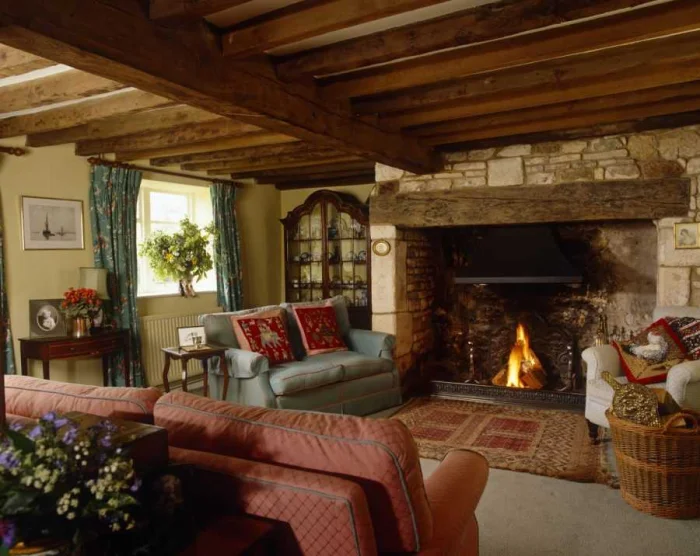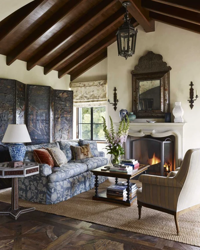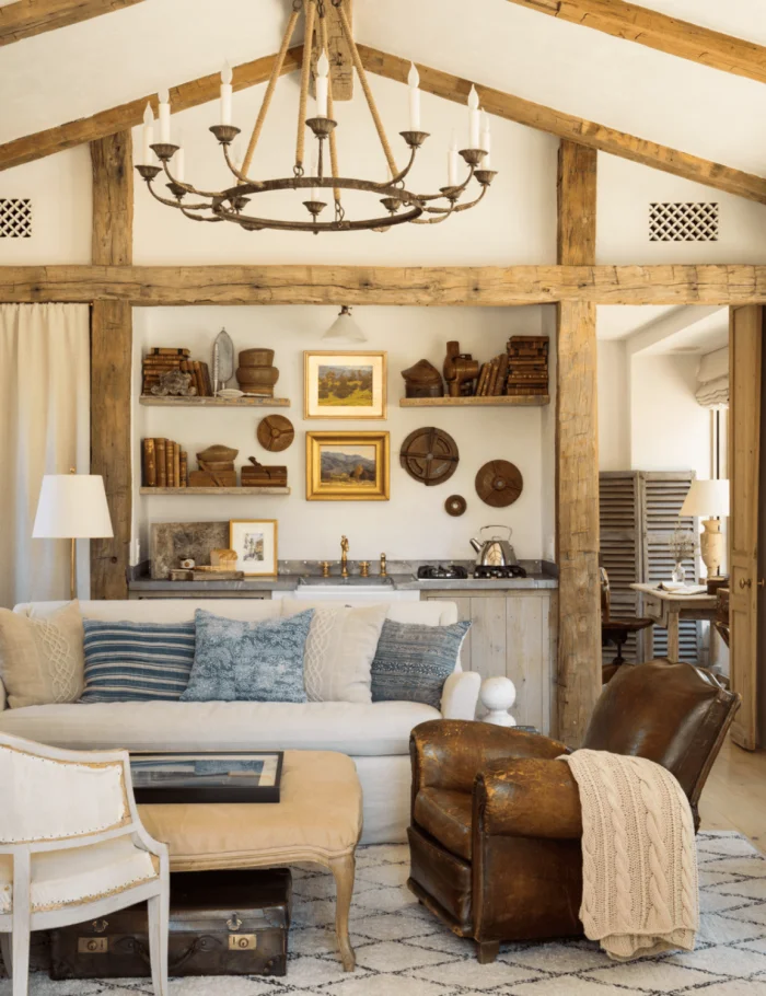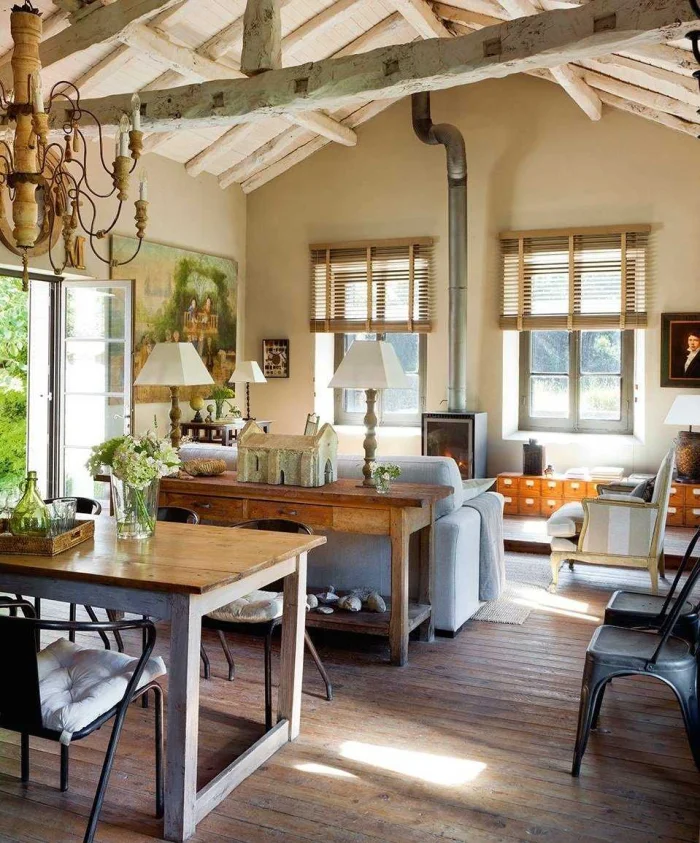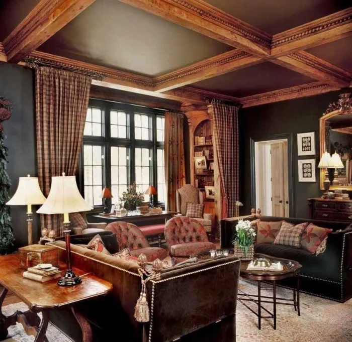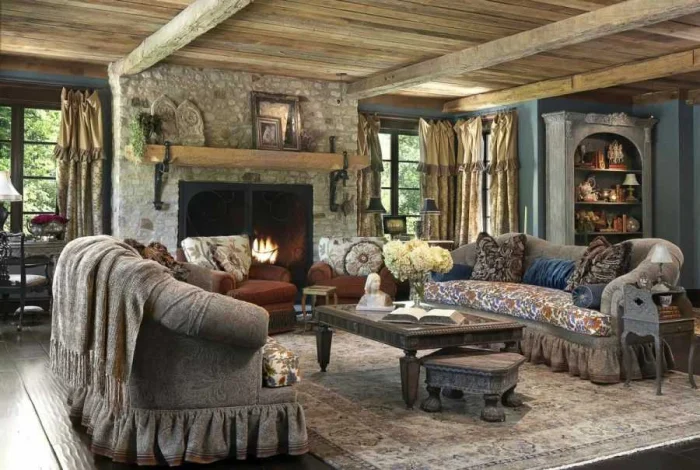 Потолочные балки — мощный штрих. В квартире настоящие тяжёлые балки могут быть небезопасны, но кто мешает использовать лёгкие полиуретановые или картонные имитации? Они выглядят так же убедительно.