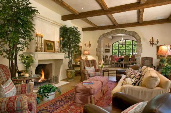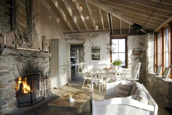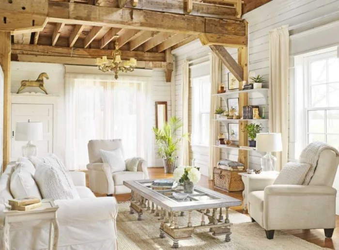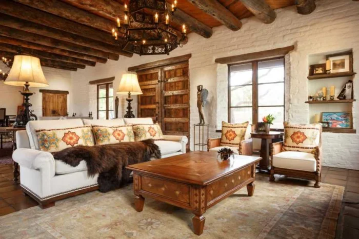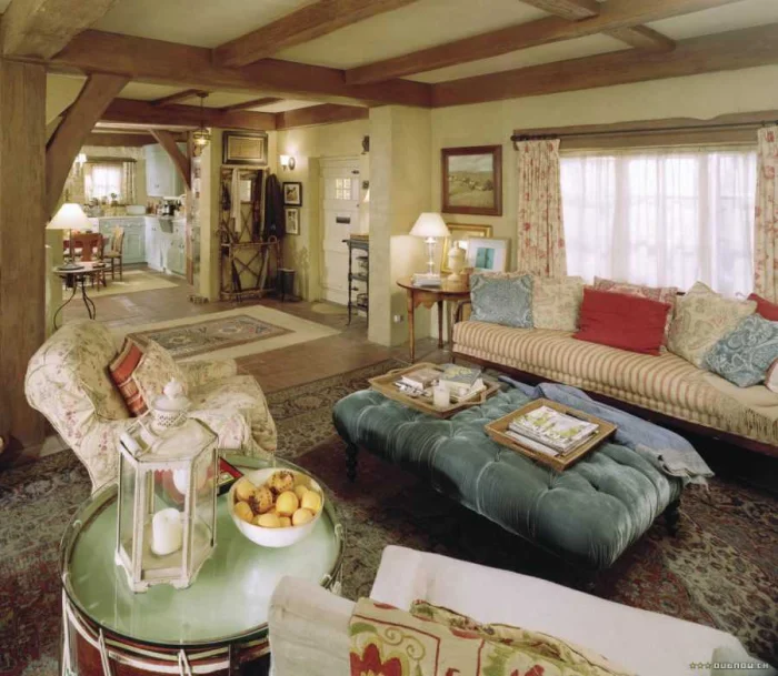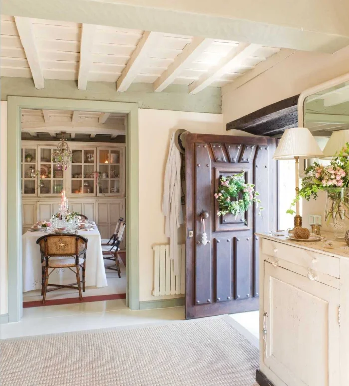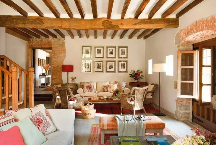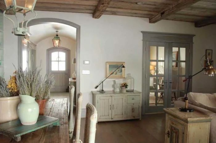 - Потолок: классическая побелка, деревянные балки или натяжное полотно с фактурой древесины.
