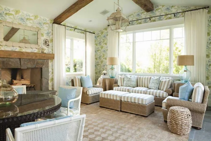 - Стены: тёплые обои с растительным принтом или стеновые панели, стилизованные под доски.