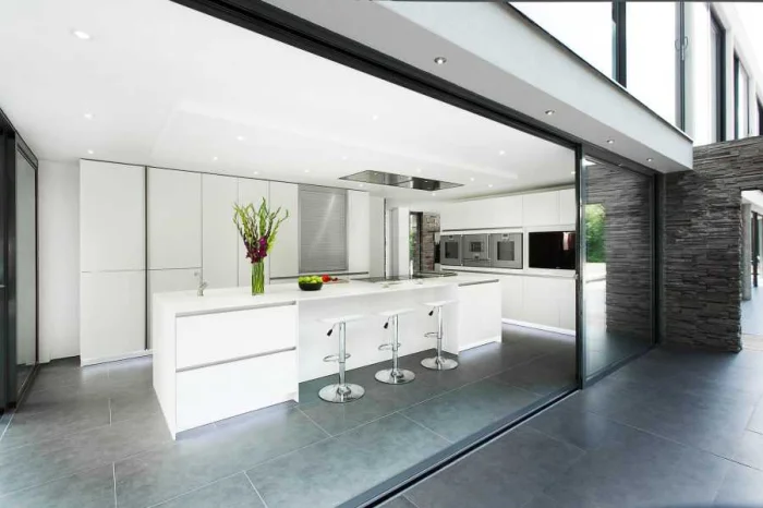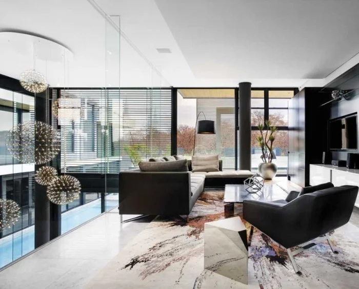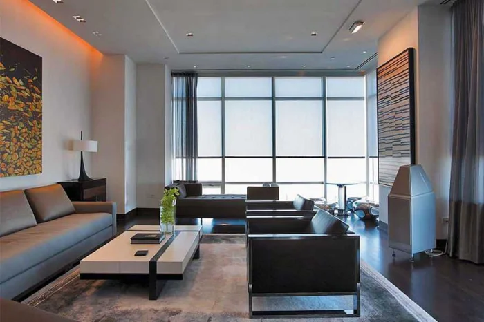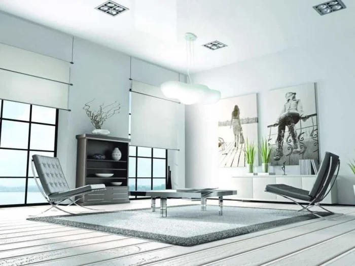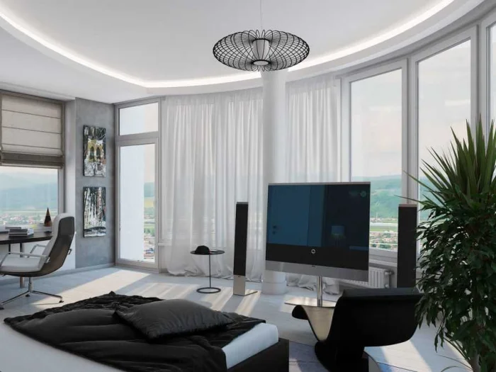 Не забудем про главный источник — окна. Идеальный вариант — панорамное остекление. Но в реальности чаще — пластиковые окна с максимально тонкими переплётами. Шторы? Только если это строгие рулонные или ультрасовременные электрожалюзи, которые опускаются по таймеру. Белый цвет рам — классика, но можно заказать ламинацию под металлик или тёмный графит.