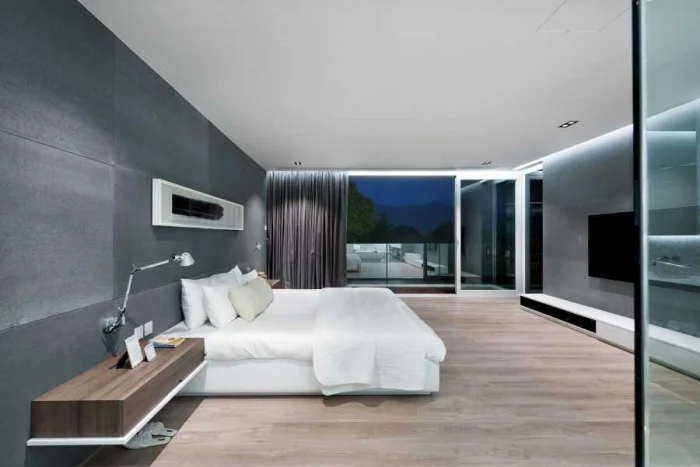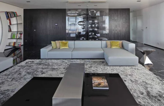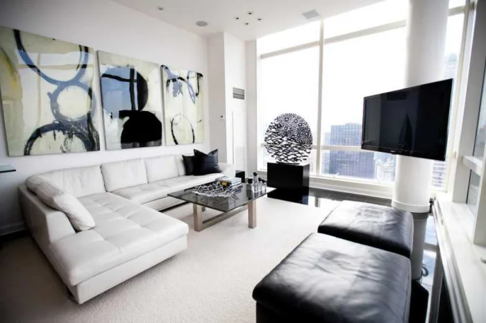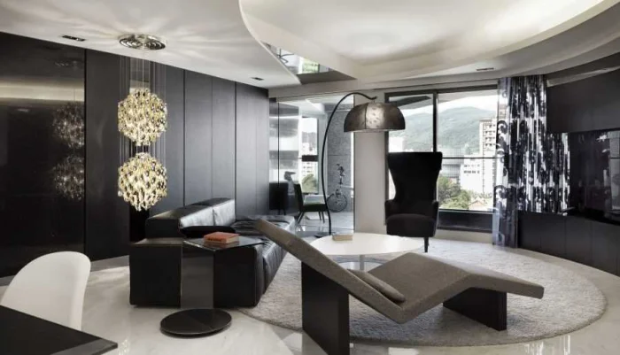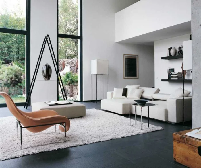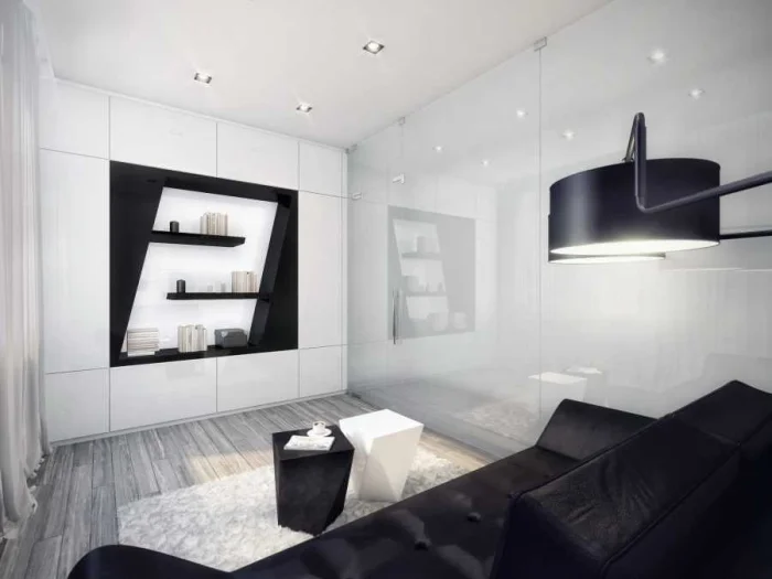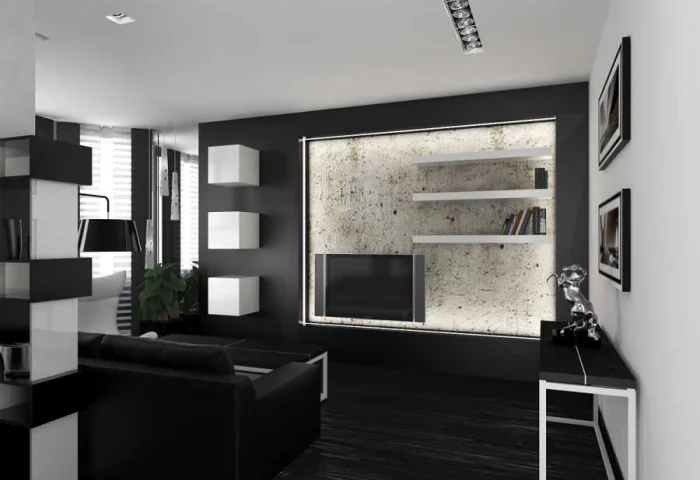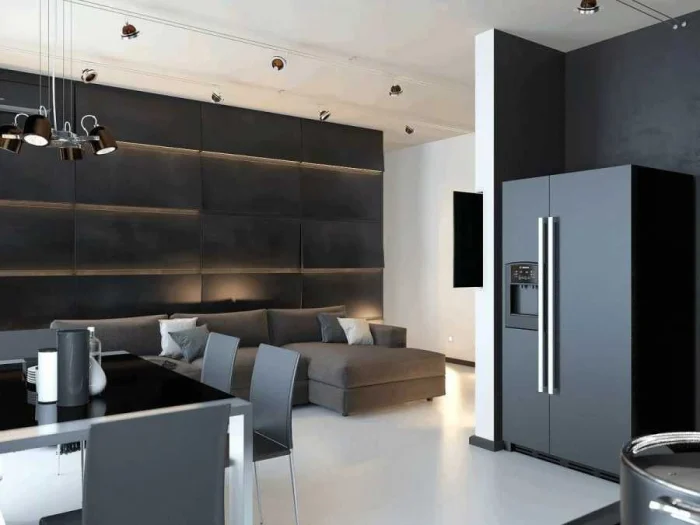 Главное правило: мебель не должна сливаться со стенами. Она обязана контрастировать, создавая чёткие, графичные акценты.