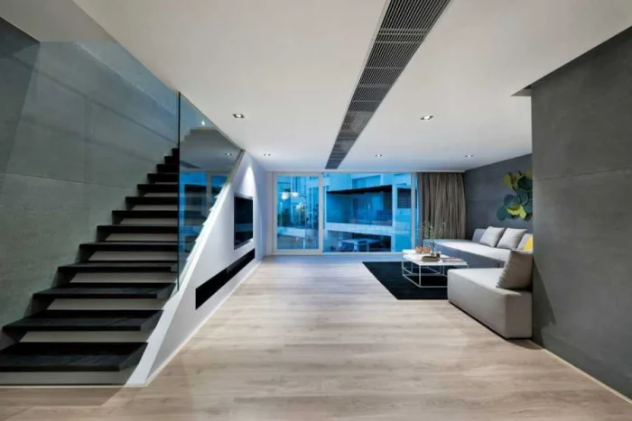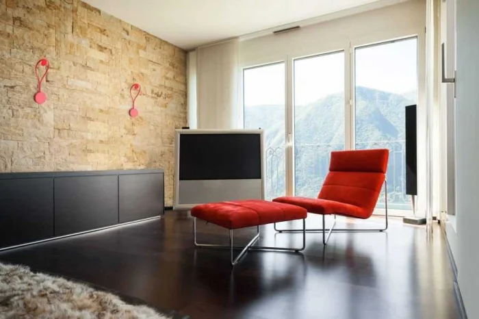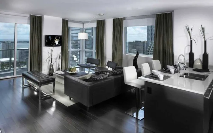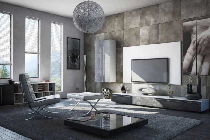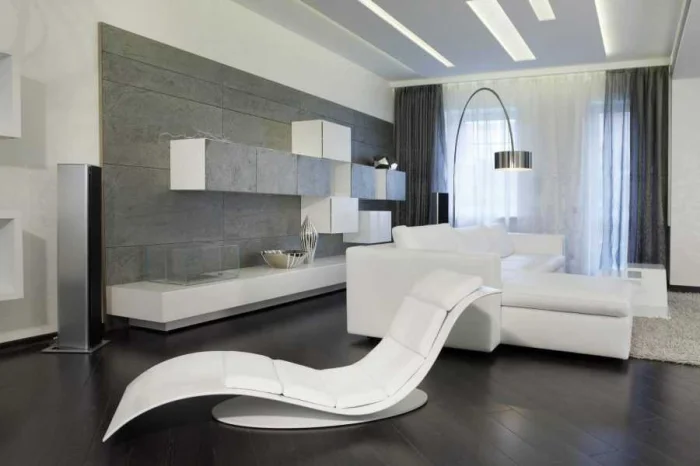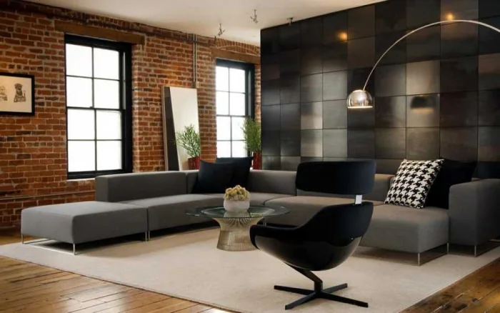 - Пол: ламинат с эффектом камня или металла, полированный бетон, однотонный ковролин.