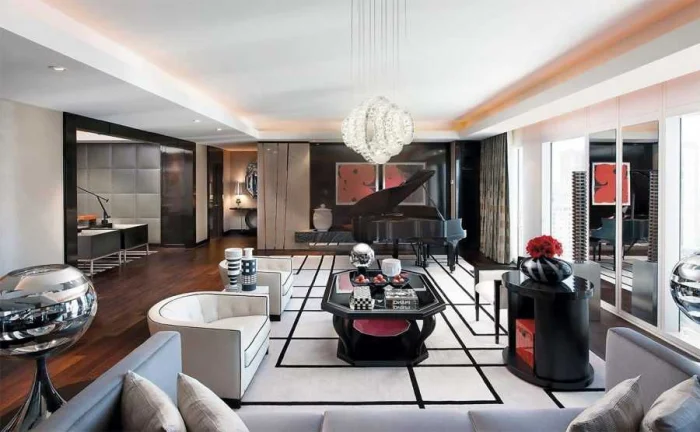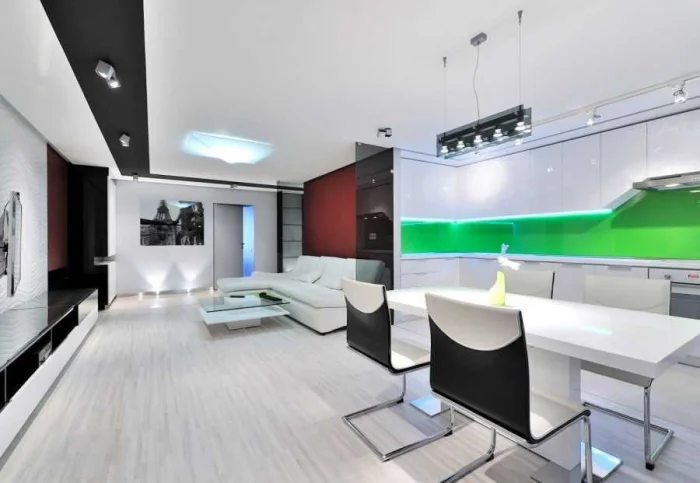 Освещение в хай-теке — отдельный вид искусства. Вычурные люстры с хрустальными подвесками здесь — моветон. Их место занимают: