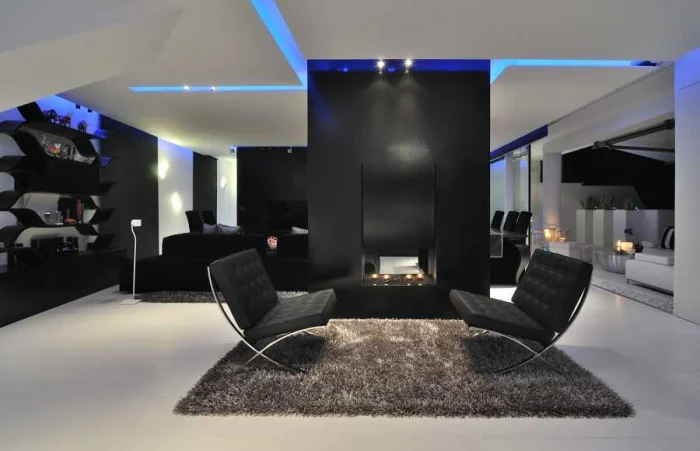 - Декоративные: электрокамин с 3D-эффектом пламени, аквариум с LED-подсветкой, большая чёрно-белая фотография в тонкой раме.