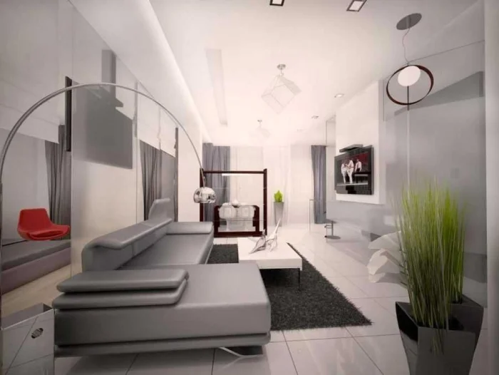Мебель в хай-теке часто стремится к невидимости. Зачем громоздкий гарнитур, если можно использовать встроенные ниши? Зачем распашные дверцы, если есть раздвижные купе? Прямой кухонный гарнитур часто практичнее углового. А вместо массивного дивана — встроенная в стену откидная кровать.