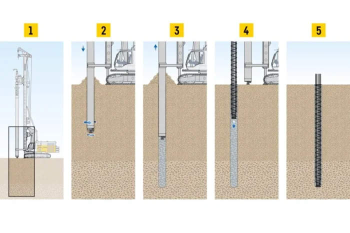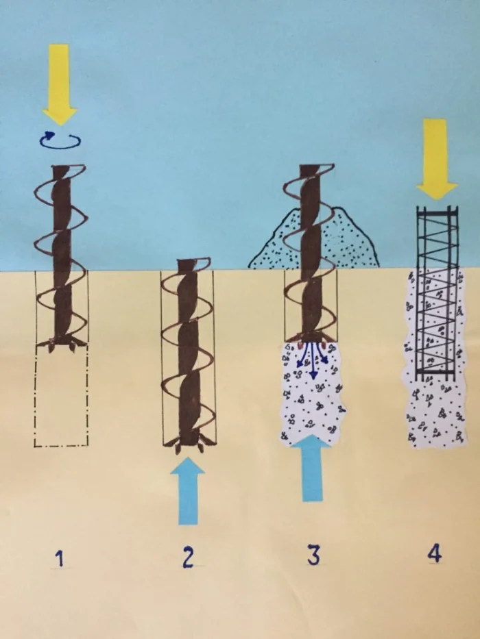 Всё просто, как бутерброд, только прочнее. Сначала в грунте бурят скважину до плотных слоёв. Потом туда устанавливают каркас из арматуры и заливают бетон. Получается монолитная колонна, которая прочно сцепляется с окружающим грунтом. Диаметр и конфигурацию можно менять под нужды проекта — гибкость на высоте!
