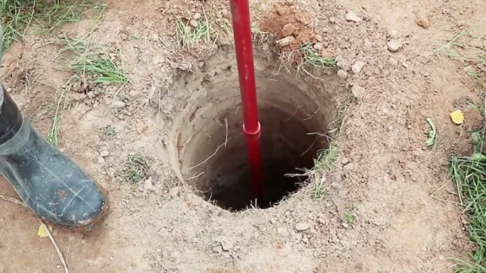- Бурение скважины: Вращающийся бур вгрызается в землю на расчётную глубину. Здесь важно контролировать вертикаль и не допустить осыпания стенок.
