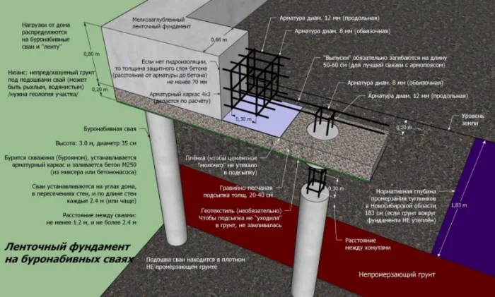 Проект указывает: диаметр свай, глубину, шаг, схему армирования, тип ростверка. Без проекта — только на свой страх и риск.
