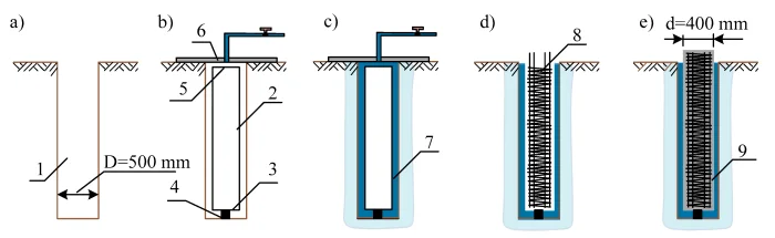 - Бурение — с контролем глубины и диаметра. На сыпучих грунтах — сразу в обсадную трубу.