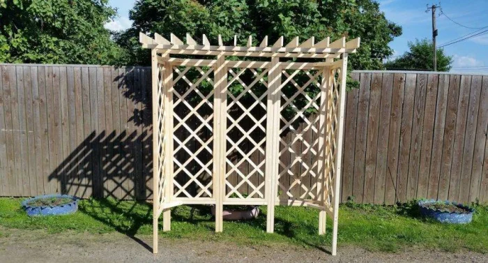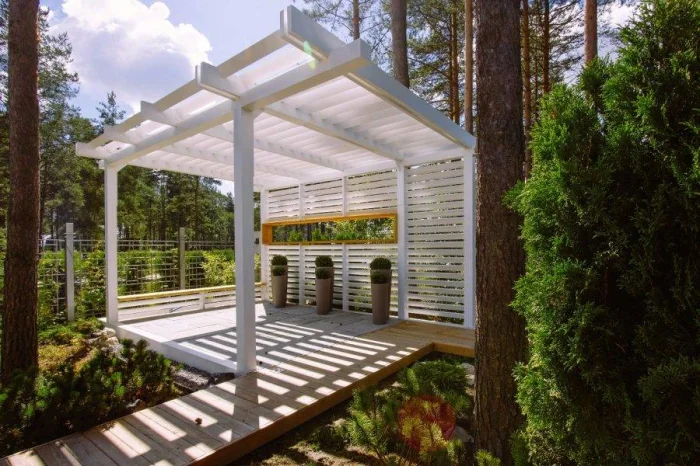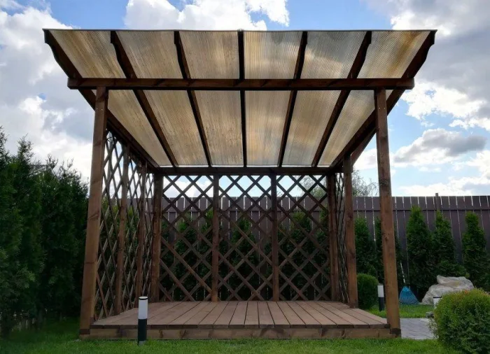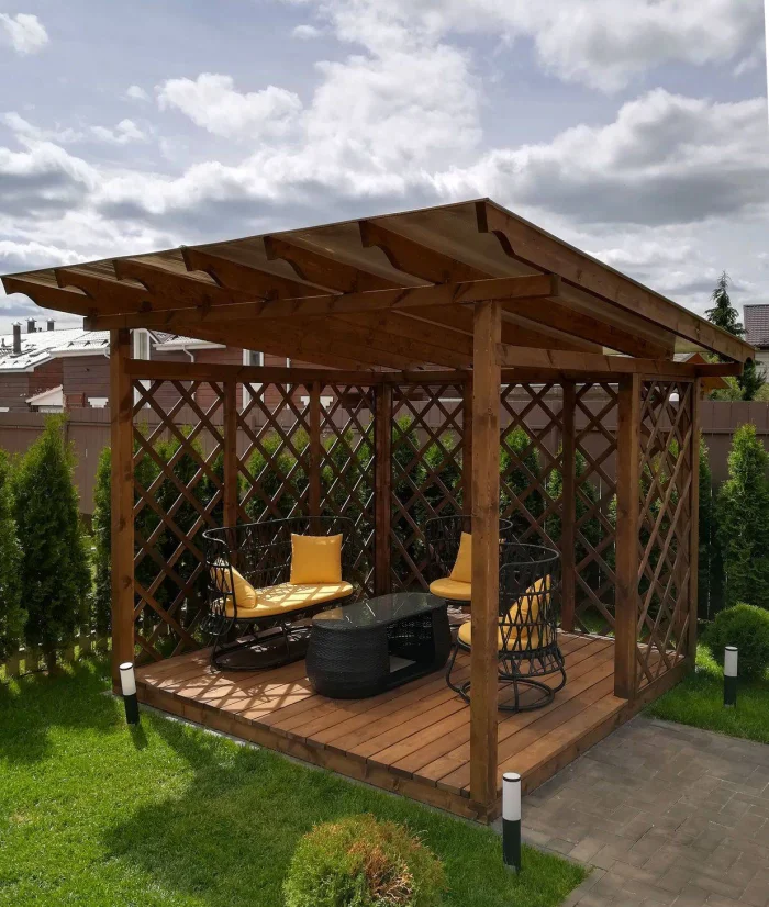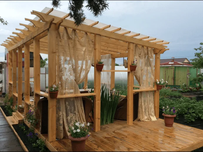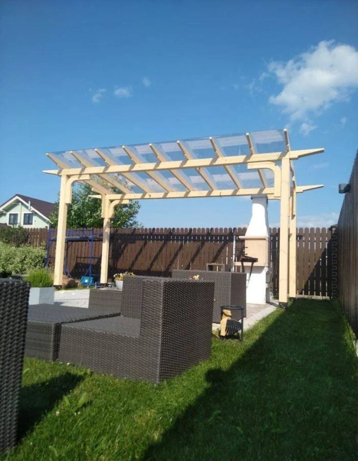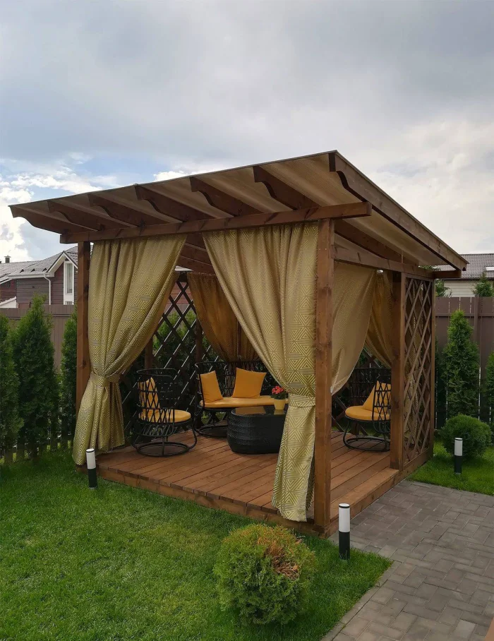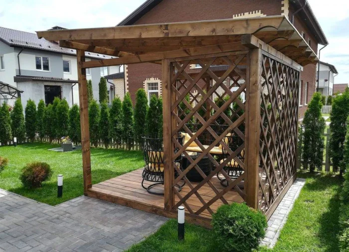 Представьте себе полуоткрытую беседку со стенами и крышей в виде решётки. Вот это и есть пергола. Она отлично спасает от солнца, создаёт уют, но от сильного дождя или ветра, конечно, не защитит. Летний вариант, не более.