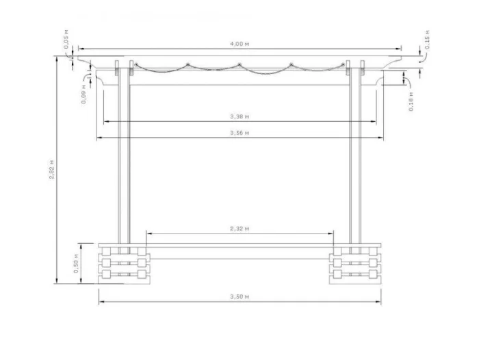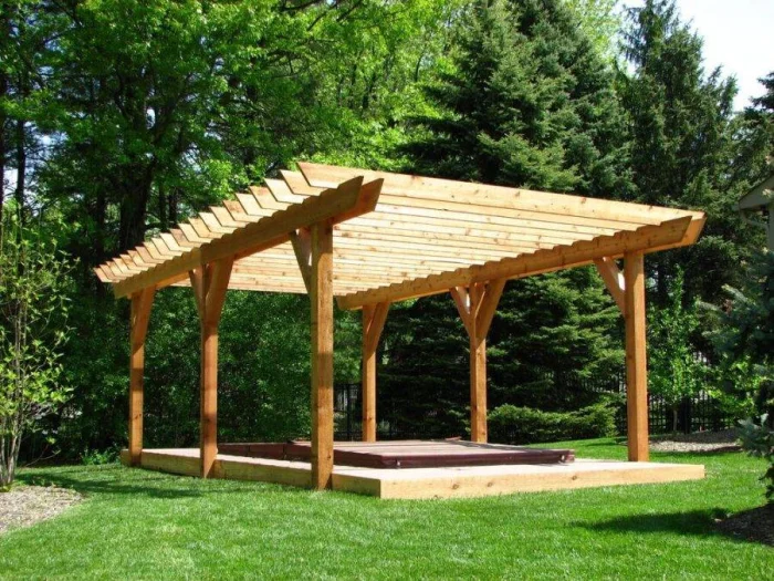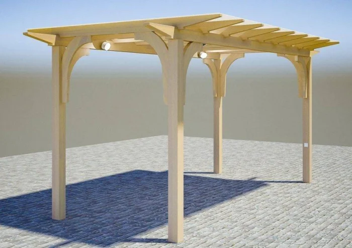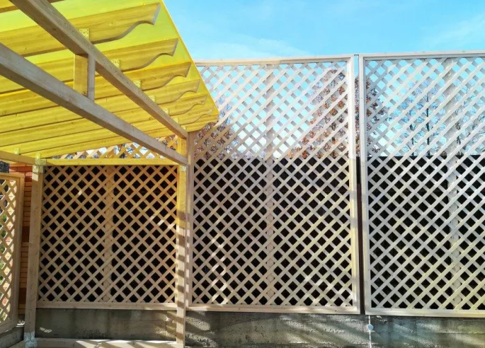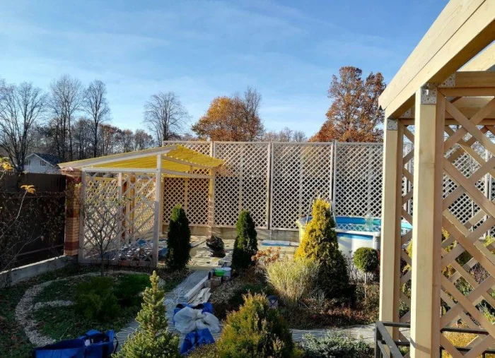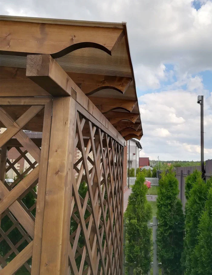 Хотя, будем честны, её истинное призвание — тёплый сезон. Под такой решётчатой крышей приятно прятаться от зноя, а если натянуть тент или брезент — то и от внезапного дождика. Конструкция лёгкая, вес держат вертикальные опорные столбы, обшитые рейками и соединённые сверху балками. Ничего лишнего.
