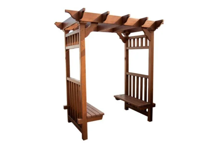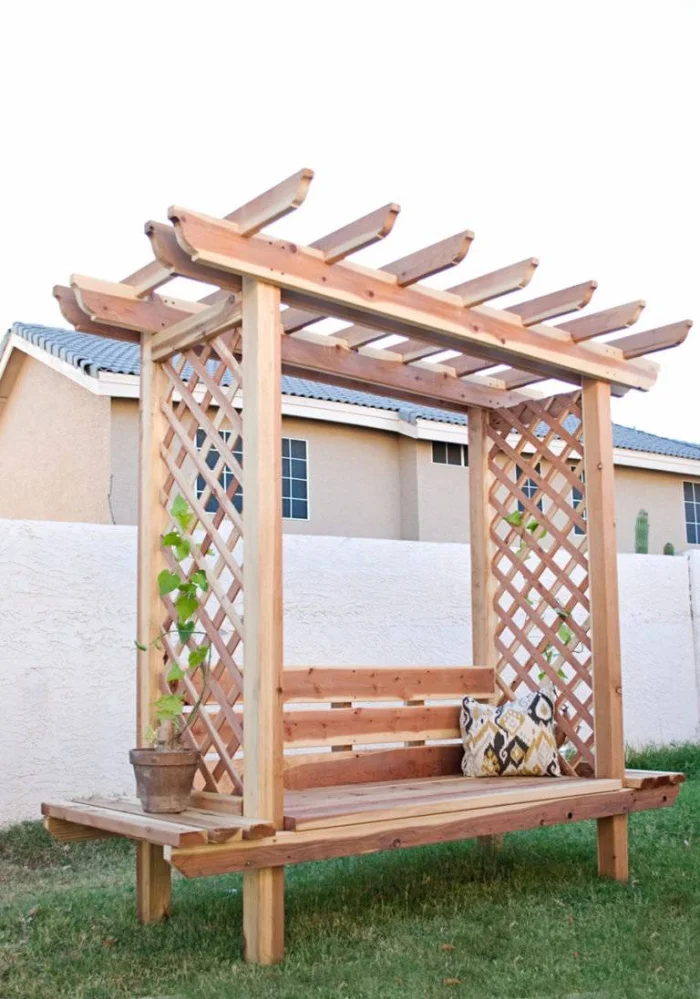 Строить перголу — одно удовольствие. Чаще всего её собирают из готовых материалов: брусьев для каркаса, реек или досок для обрешётки. Выбор широк: