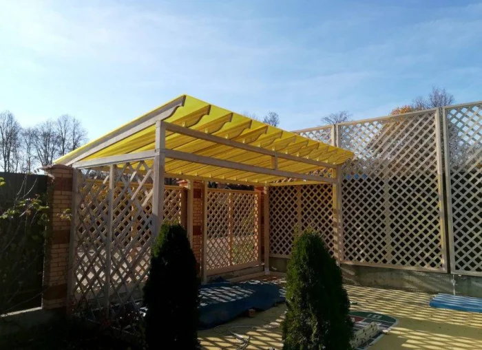 - Накрыть решетчатую крышу тентом или еврошифером;