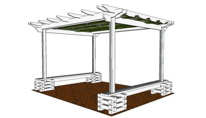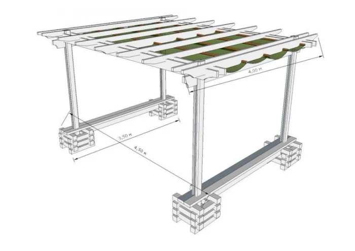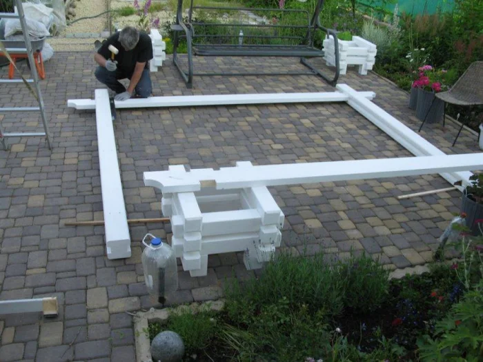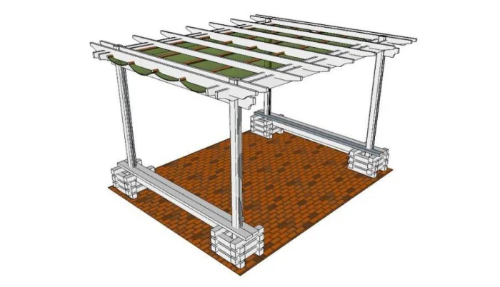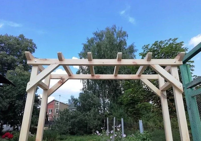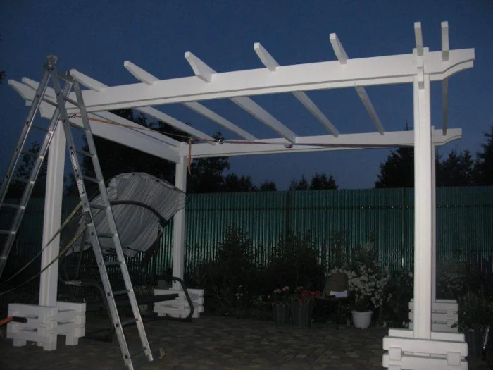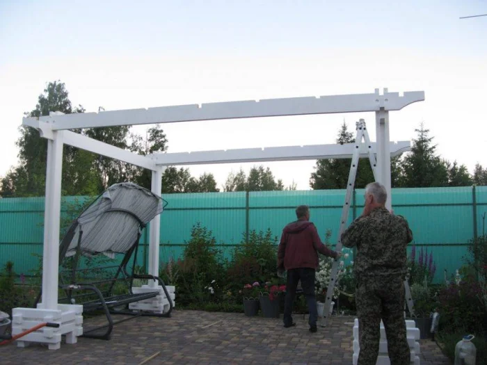 Построить перголу проще, чем любую другую садовую постройку. Если основание готово, можно обойтись без сложных чертежей. Основные этапы: