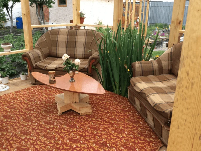 Мебель может быть деревянной, плетёной или мягкой — на ваш вкус. Занавеси и сетка актуальны для очень открытых конструкций. Свет — обязателен, если планируете засиживаться допоздна. Лучше выбрать на солнечных батареях или аккумуляторах.
