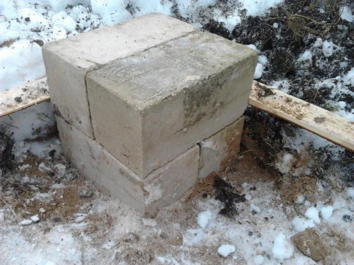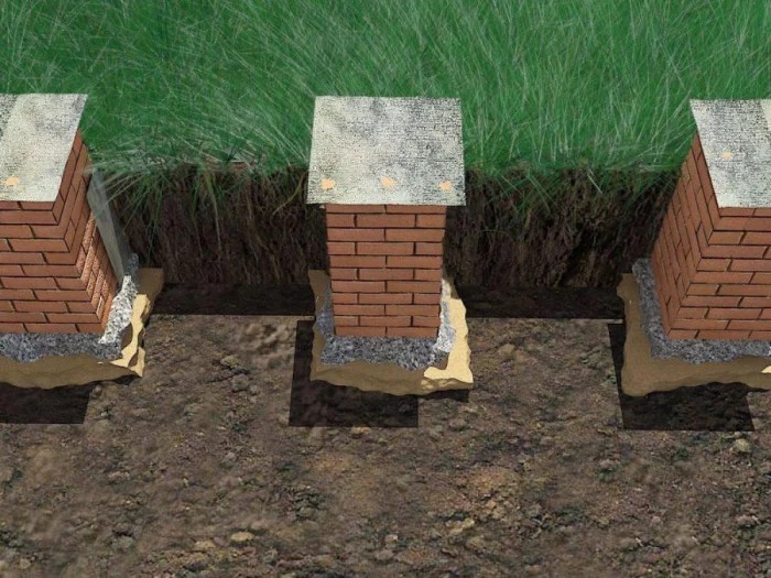 Можно сделать и кирпичные столбики. После заливки бетонного основания (но чаще и ближе друг к другу, через метр), на него кладется раствор, и выводится столбик в два кирпича. Каждый новый ряд кладется перпендикулярно предыдущему. Высота — около 20 см над землей. Надежно и солидно.