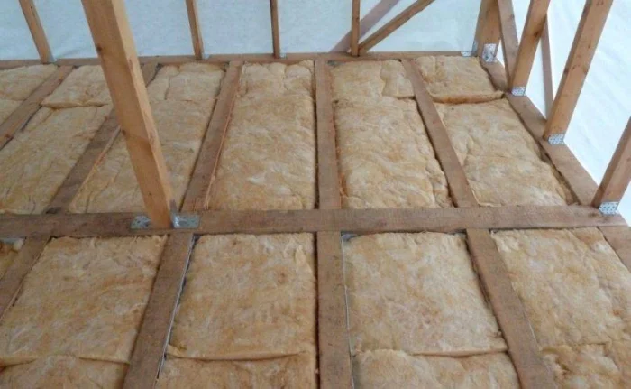 - В пространство между лагами плотно укладываем утеплитель (минвату, пеноплекс).