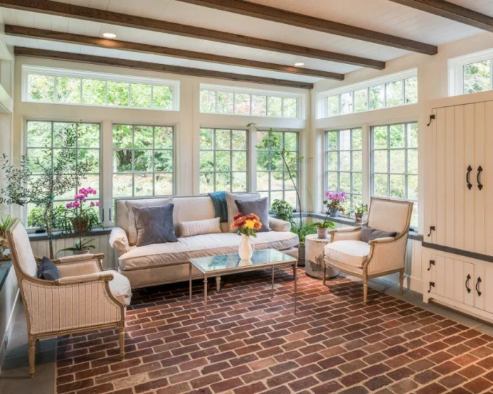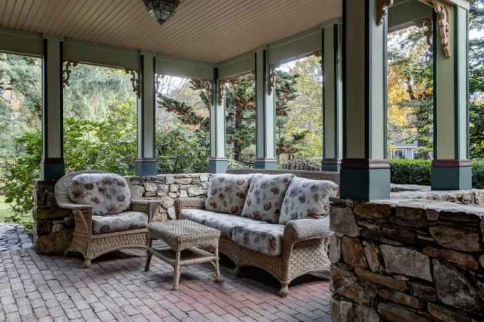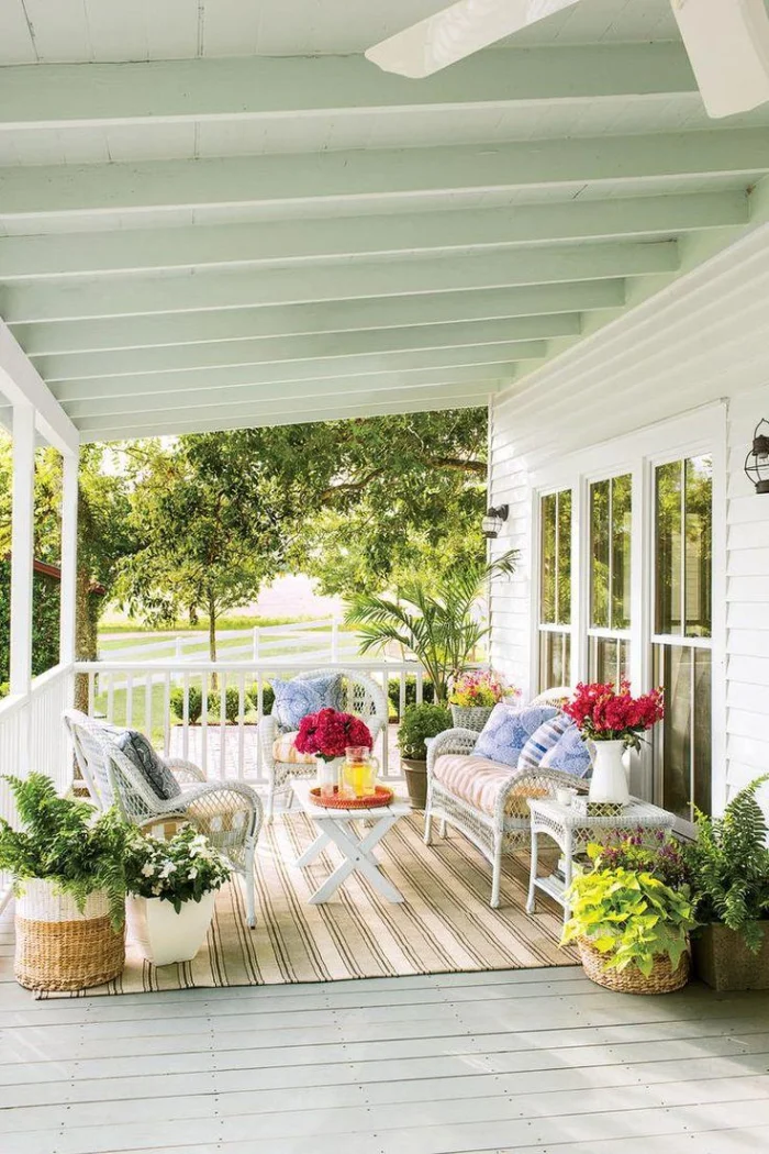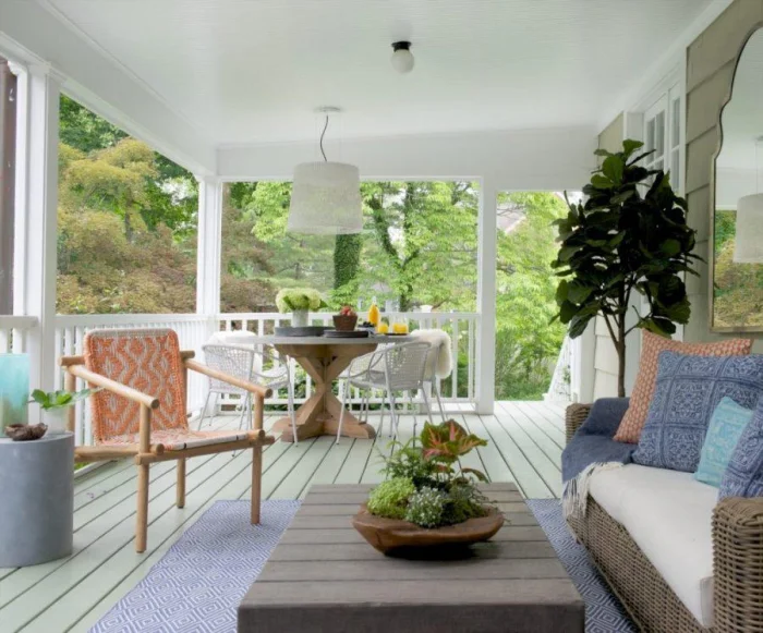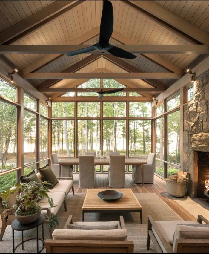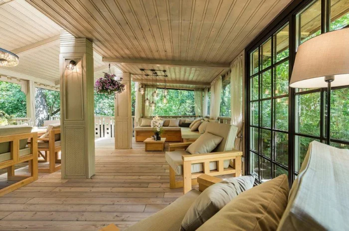 Здесь есть два пути. Можно сделать веранду чуть ниже уровня дома, организовав несколько ступенек. Это классический и очень уютный вариант. А можно вывести пол вровень с внутренними помещениями — так пространство визуально сольется, и вы получите настоящую продолженную гостиную под открытым небом. Что больше вашему стилю?