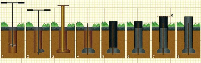 Берем лопату и копаем. Глубина — около 80 см, этого достаточно для устойчивости в нашем климате. Старайтесь, чтобы стенки ям были вертикальными и аккуратными. Помните, мы же строим надолго?