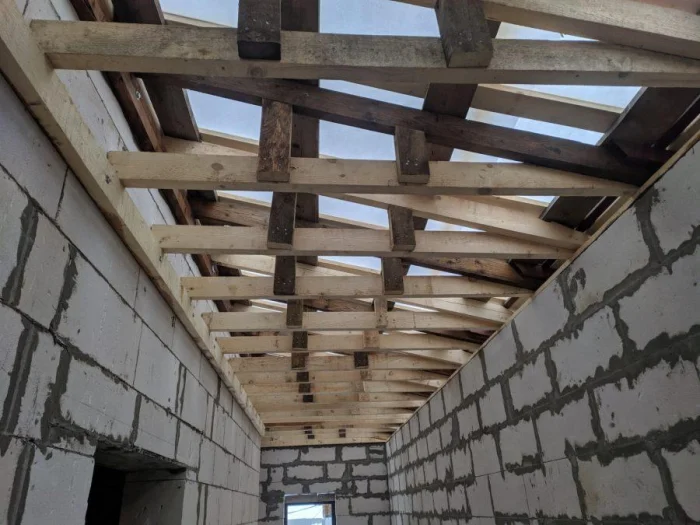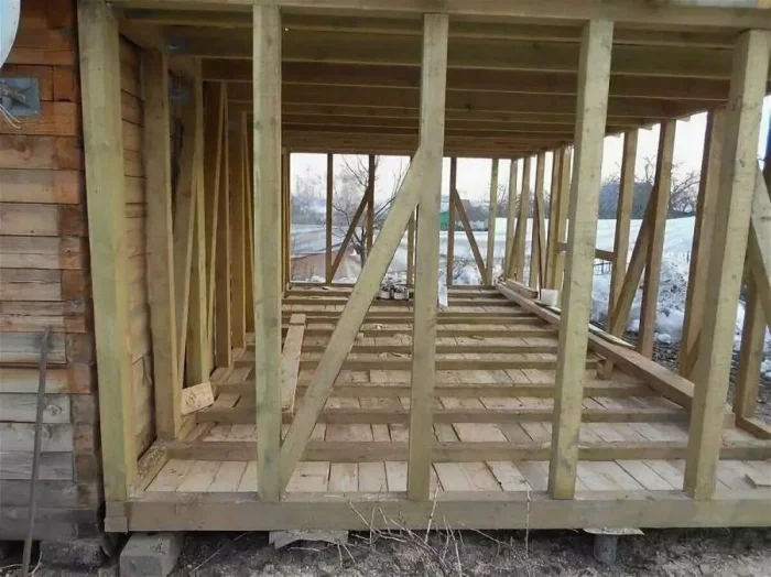 Когда все балки на месте, измеряем расстояние между ними и нарезаем поперечные бруски-распорки. Они добавят каркасу жесткости и предотвратят скрип будущего пола. Прибиваем их между балками. Каркас готов! Теперь это уже не набор столбов и досок, а прочная, ровная основа.