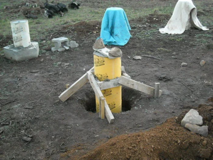 Замешиваем бетон в тачке (или бетономешалке, если вы уже профессионал) и заливаем его в ямы вокруг столбов. Залили один — переходим к следующему. И так по всем точкам нашей ранее нарисованной сетки.