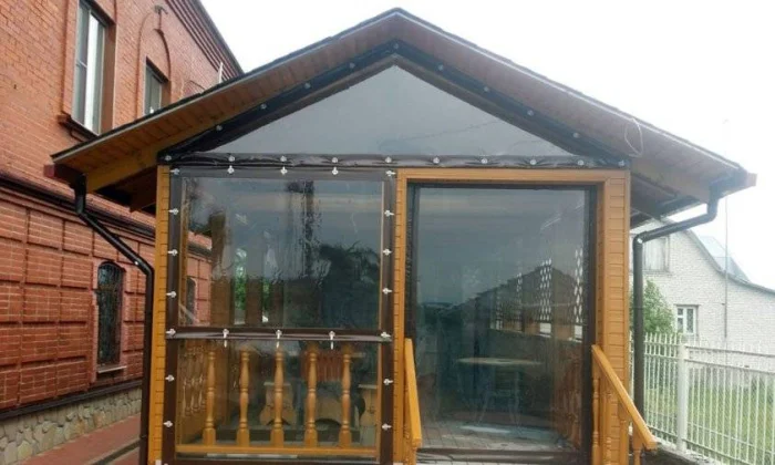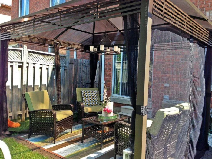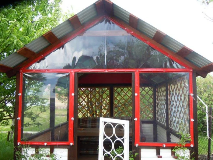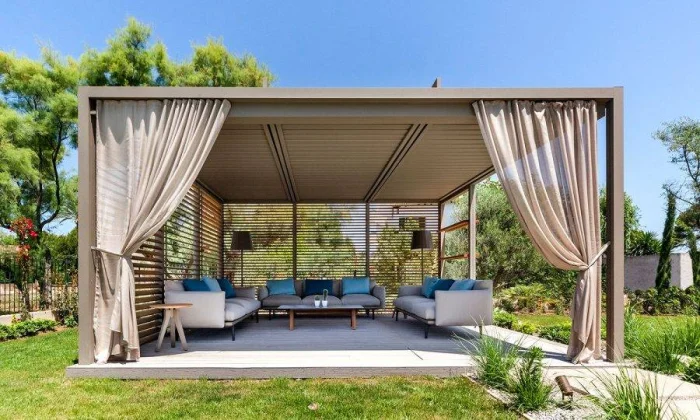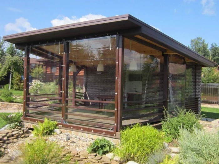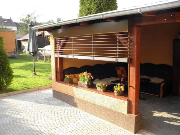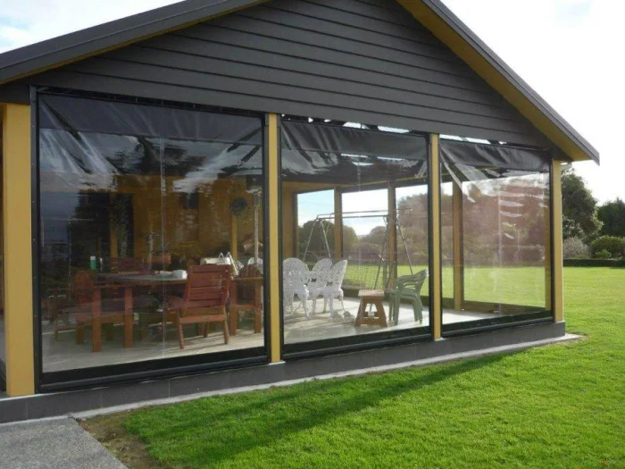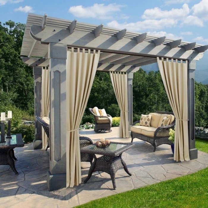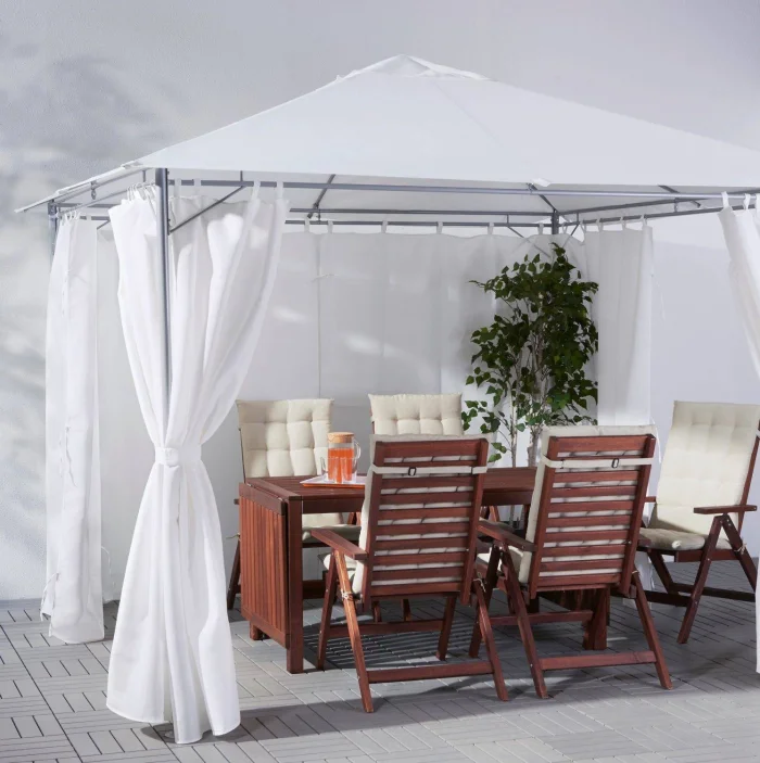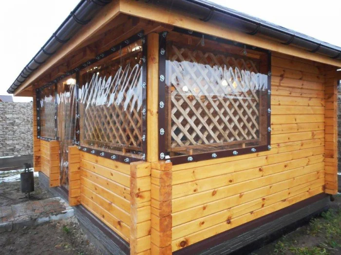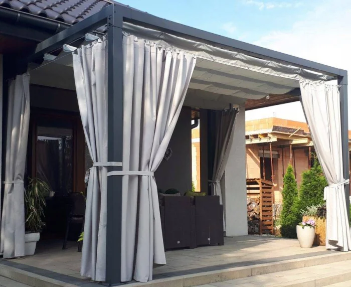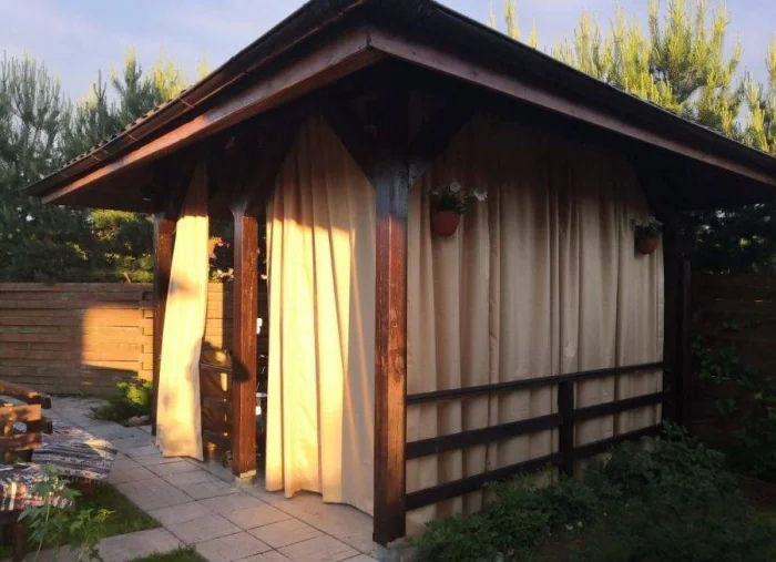 Если в вашем регионе погода любит сюрпризы, присмотритесь к шторам из поливинилхлорида. Это броня против ливня и ветра. Они бывают прозрачными (чтобы не закрывать вид), цветными, с рисунком. Но есть и оборотная сторона медали: они почти не «дышат». В беседке с плотно застёгнутыми ПВХ-шторами может стать душно, поэтому о проветривании стоит подумать заранее.