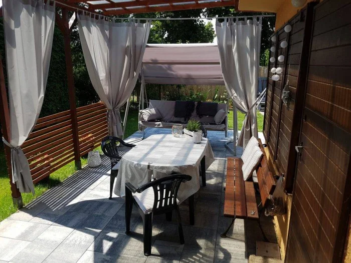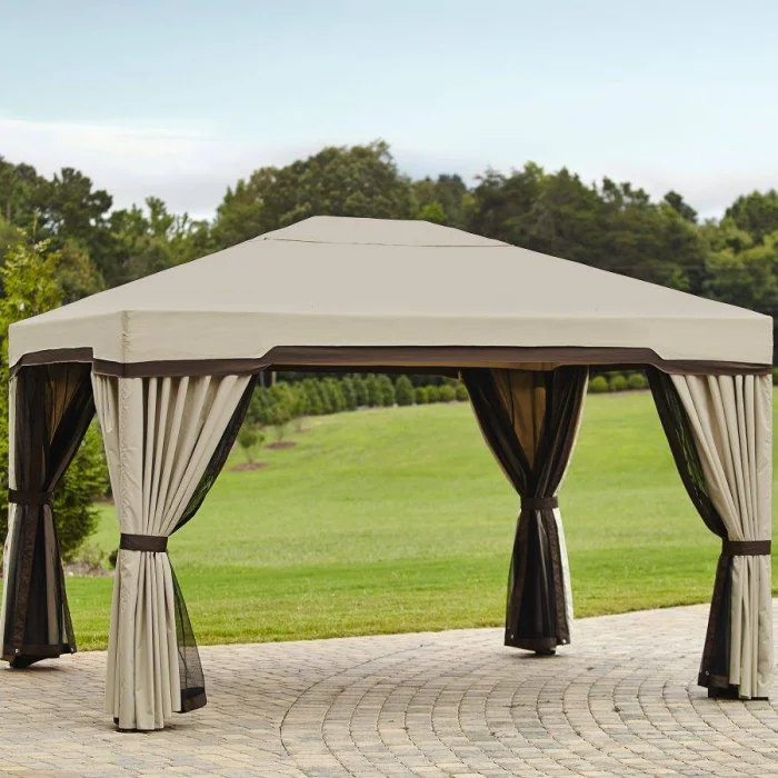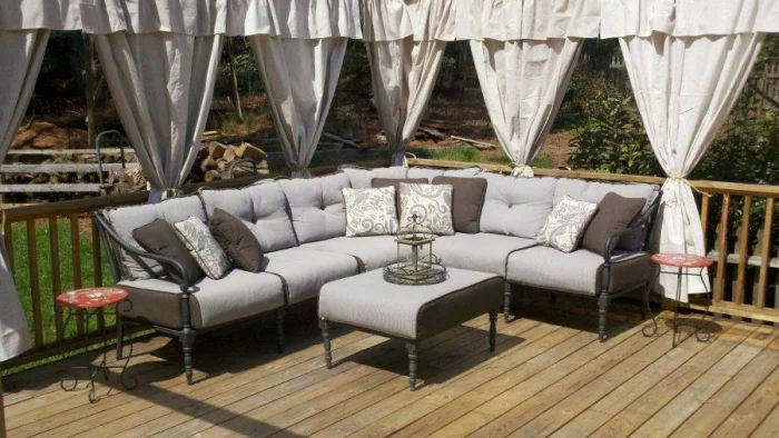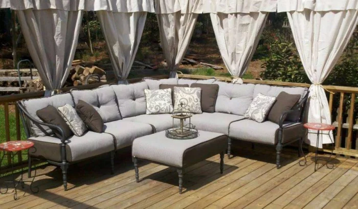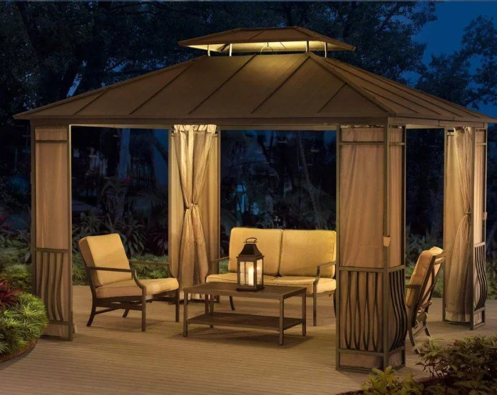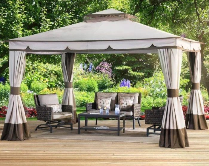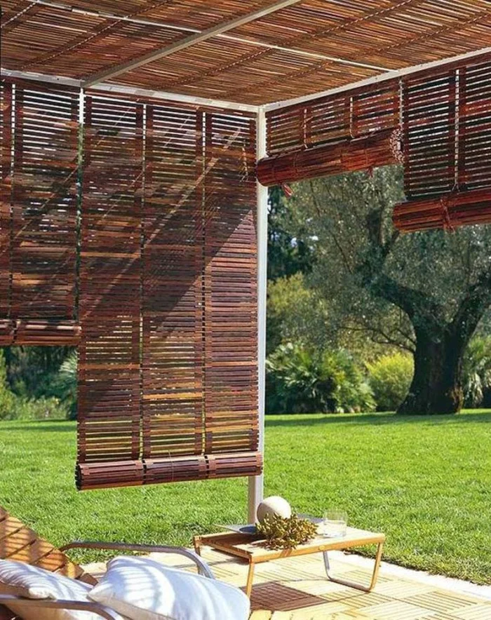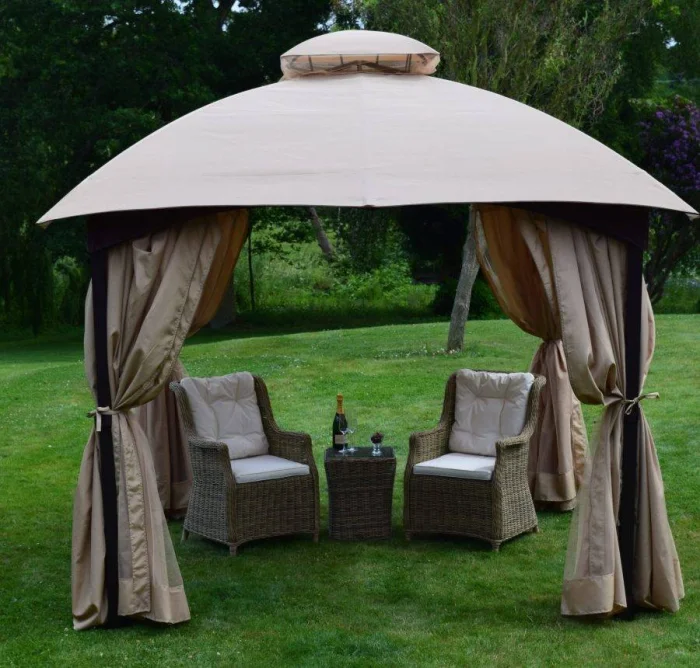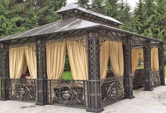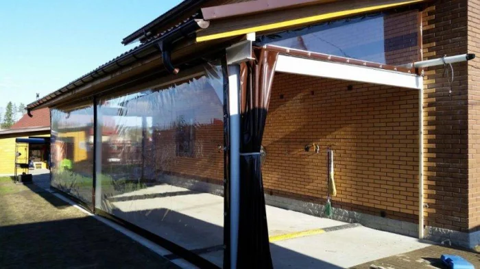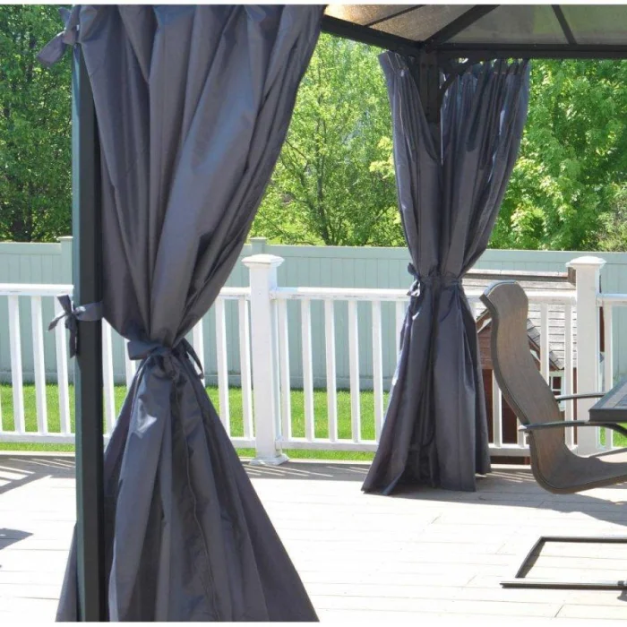 Если в вашем регионе погода любит сюрпризы, присмотритесь к шторам из поливинилхлорида. Это броня против ливня и ветра. Они бывают прозрачными (чтобы не закрывать вид), цветными, с рисунком. Но есть и оборотная сторона медали: они почти не «дышат». В беседке с плотно застёгнутыми ПВХ-шторами может стать душно, поэтому о проветривании стоит подумать заранее.