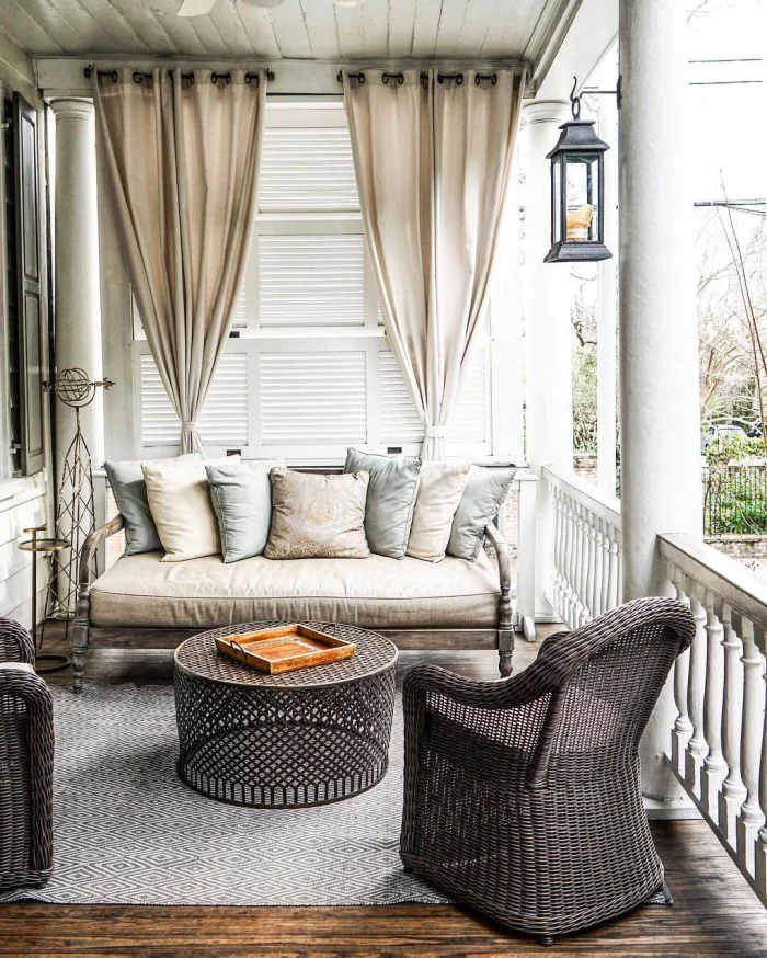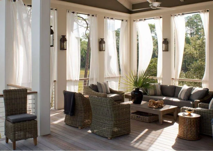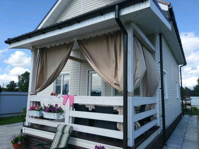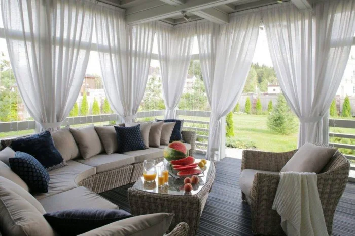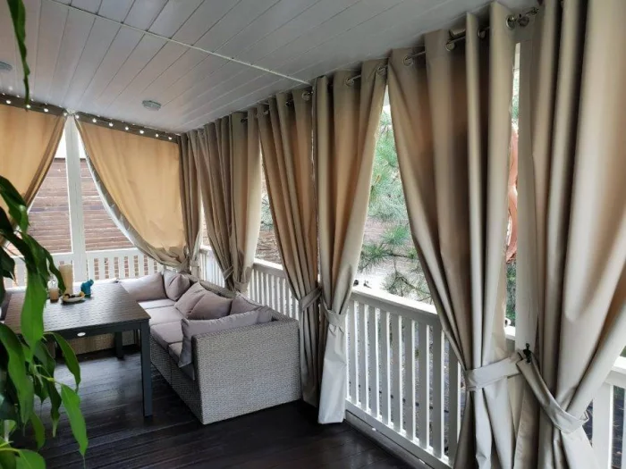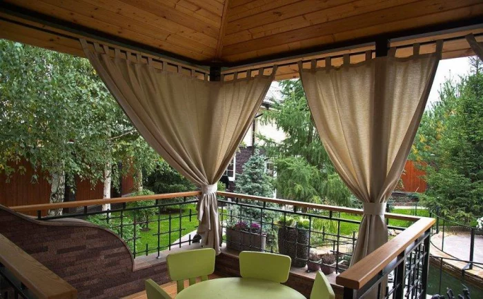 Первый вариант, который приходит в голову — тканевые шторы. Они задают тон, создают настроение лёгкости и воздушности. Чаще всего их шьют из полупрозрачных тканей: тюля, органзы, льна. Такой выбор логичен: материал мягко рассеивает солнце, скрывает от соседей и не мешает циркуляции воздуха. Но давайте будем честны: против серьёзного ливня или шквалистого ветра они бессильны.