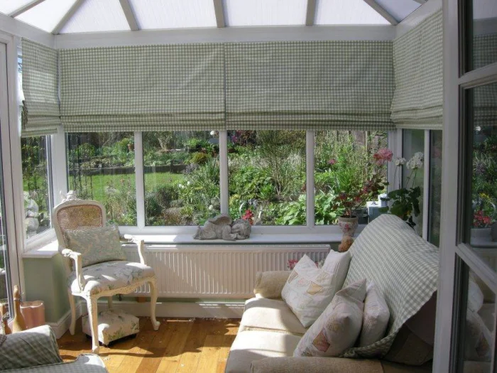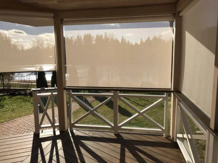 Для любителей современных решений — рулонные шторы. Обычно это полиэстер с пропиткой, наматывающийся на вал при помощи шнура. Крепятся они под самой крышей. Советую выбирать крепление на саморезы, а не на липучки — так надёжнее при сильном ветре.