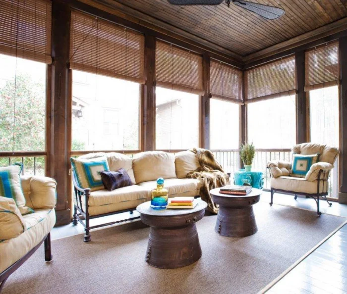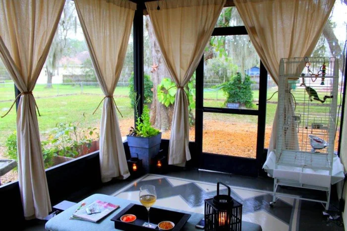 Хотите больше практичности? Обратите внимание на акрил. Эти шторы легко моются, не боятся воды и отлично справляются с солнцем, дождём и насекомыми. Есть один нюанс: воздух они пропускают плохо. Летом это может быть минусом, зато в прохладный сезон превращается в огромный плюс. Представьте: опустили полотна, включили тепловентилятор — и вот у вас уже тёплая, уютная капсула, в которой не страшна никакая осенняя сырость.