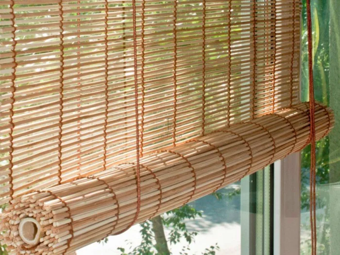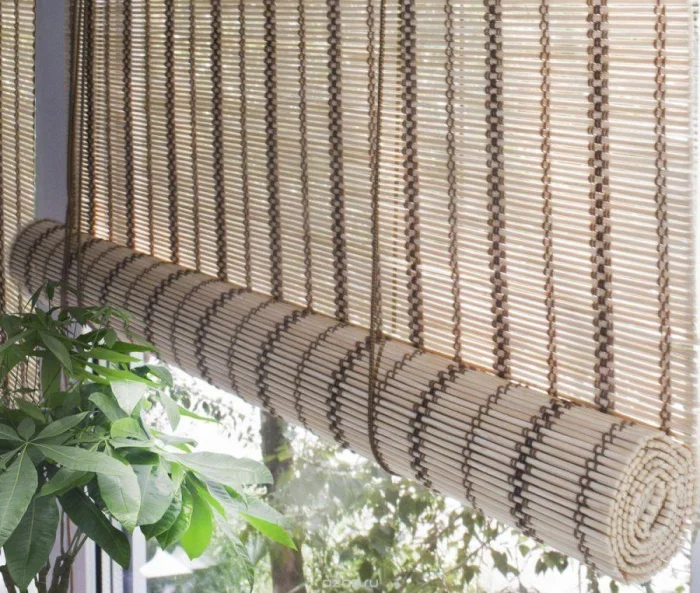 Бамбук — материал удивительный. Он прочный, но при этом невероятно лёгкий. Все тканевые или деревянные варианты хороши под прямыми лучами, а бамбук выдерживает больше. Его можно оформить как плиссированные, рулонные или римские шторы.