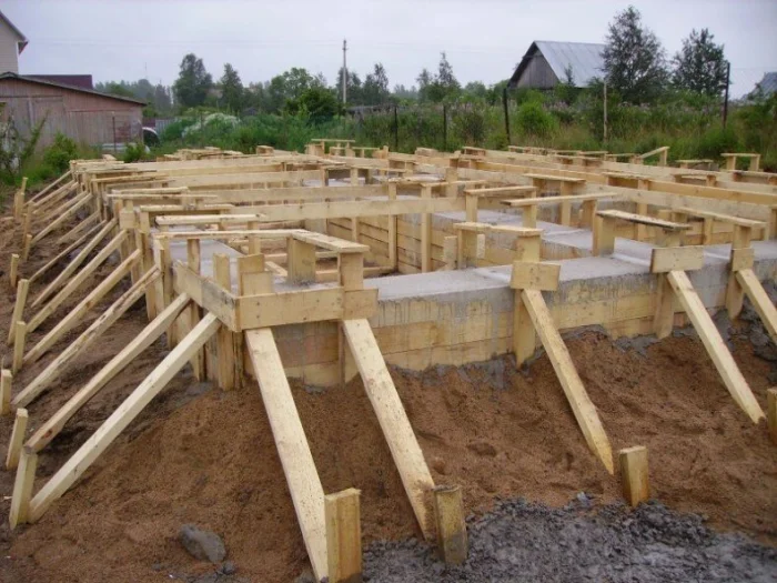 Опалубка должна быть прочной, чтобы выдержать давление бетона. Щиты из влагостойкой фанеры или обрезной доски сбиваются надежно, укрепляются распорками и укосинами. Внутренняя поверхность часто смазывается составом (например, отработкой), чтобы легче было снять щиты позже.