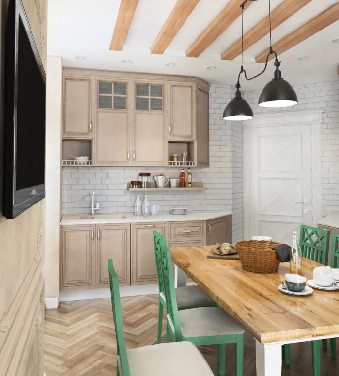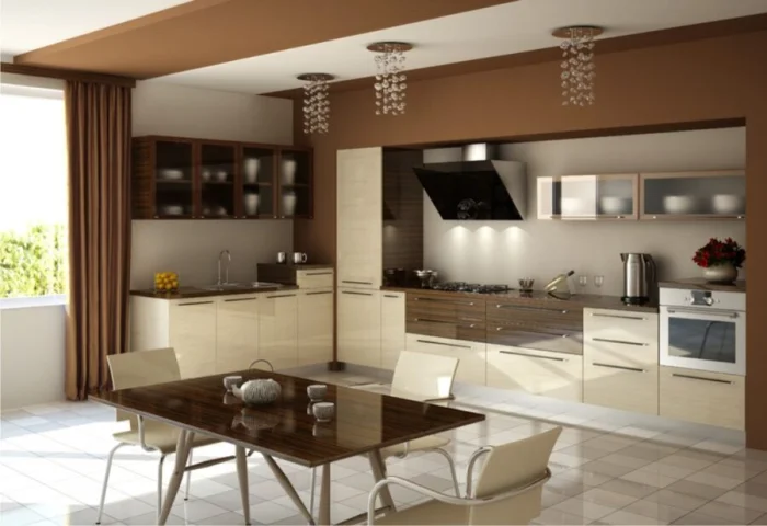 Бежевый – мастер тонких градаций. Зону отдыха (столовую) можно обозначить более светлым, воздушным оттенком. Рабочую же часть – выделить на пару тонов темнее или добавить к ней контрастного цвета.